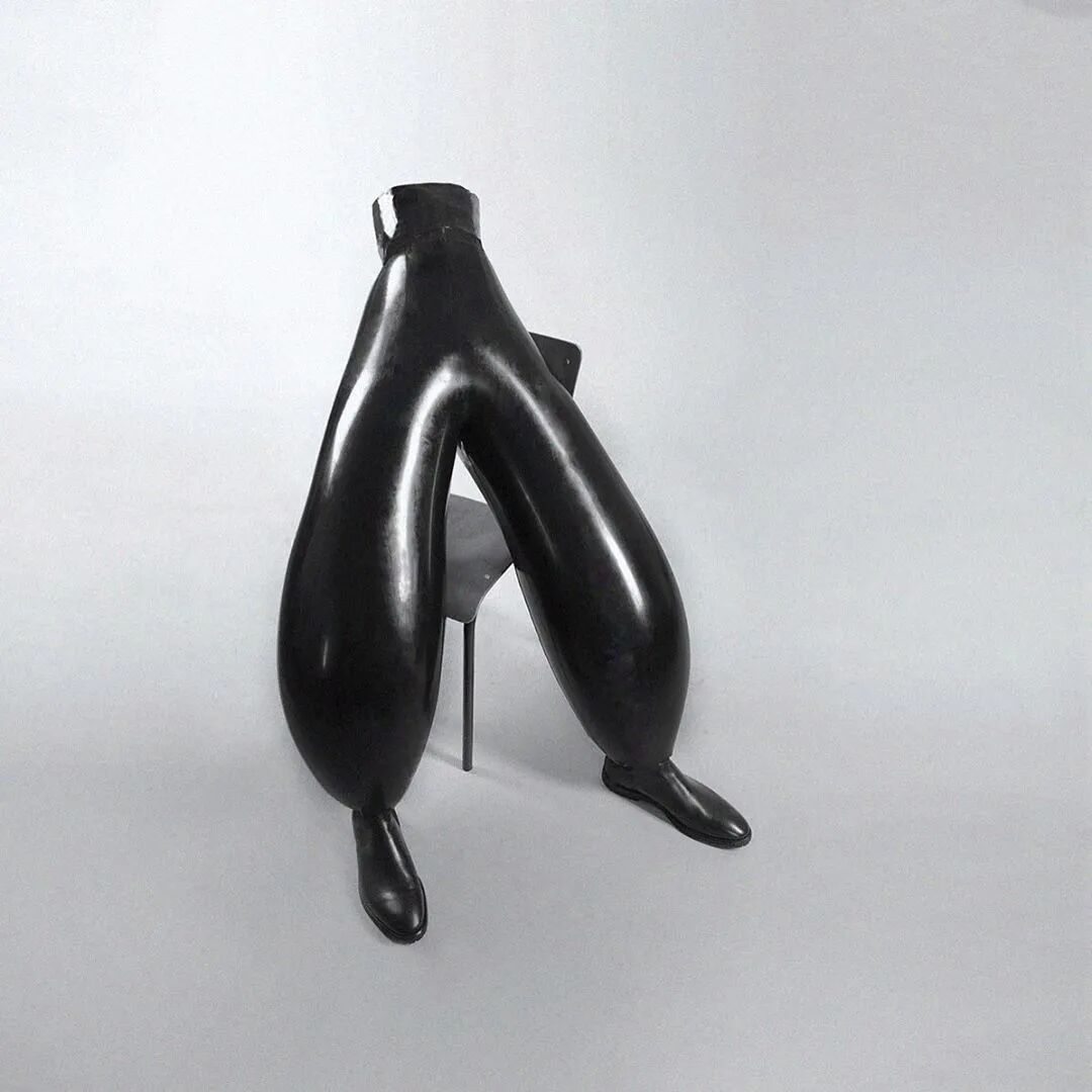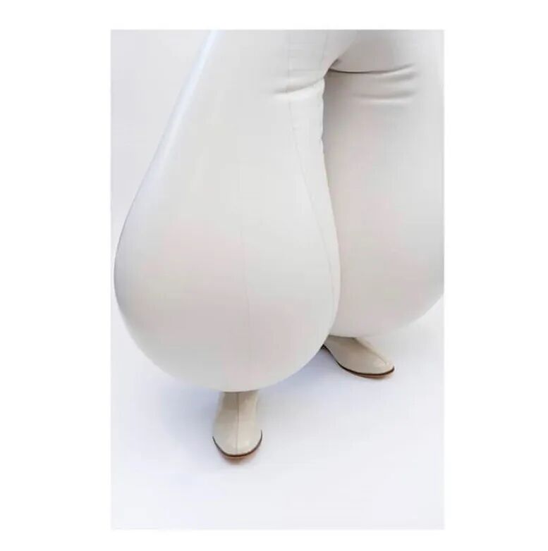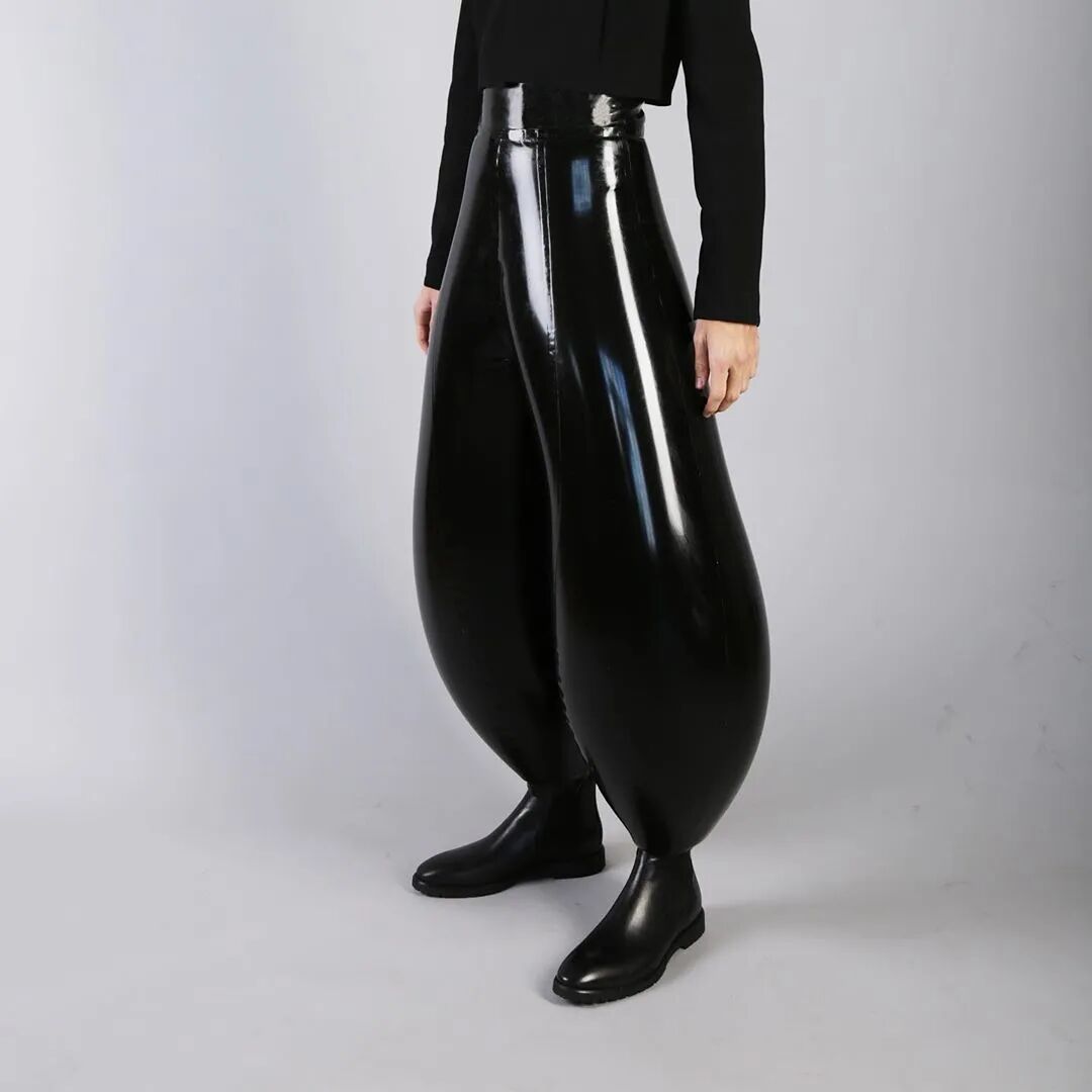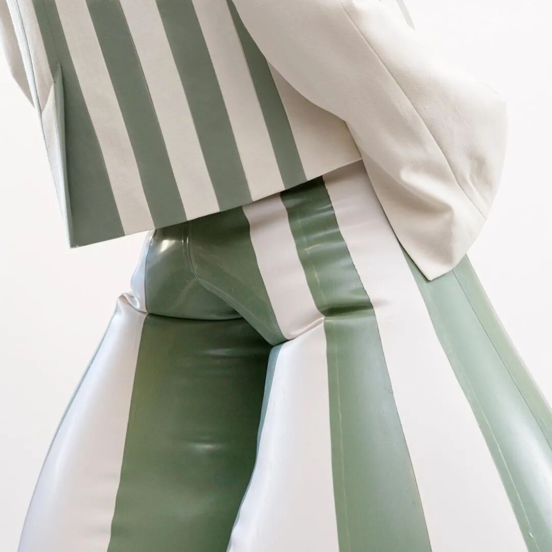 这种夸张的乳胶充气裤每个都由多达30个单独的乳胶裁片,并耗费48个小时来制作完成,这些裁片可以是纯白色,也可以是砖红色,又或是墨绿色薄荷绿色。颜色之间的对比突出了扭曲感。通过仅有7毫米宽的充气阀向裤子中充气以膨胀成如此夸张宽度的充气裤