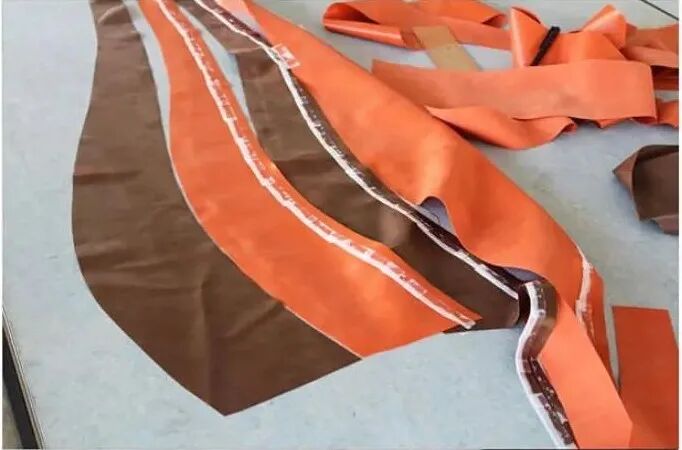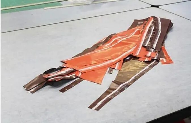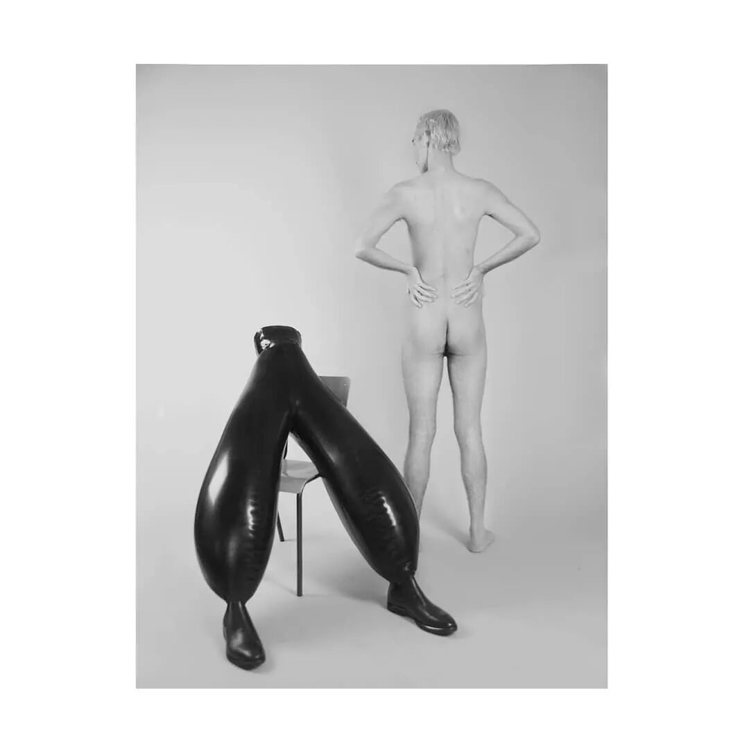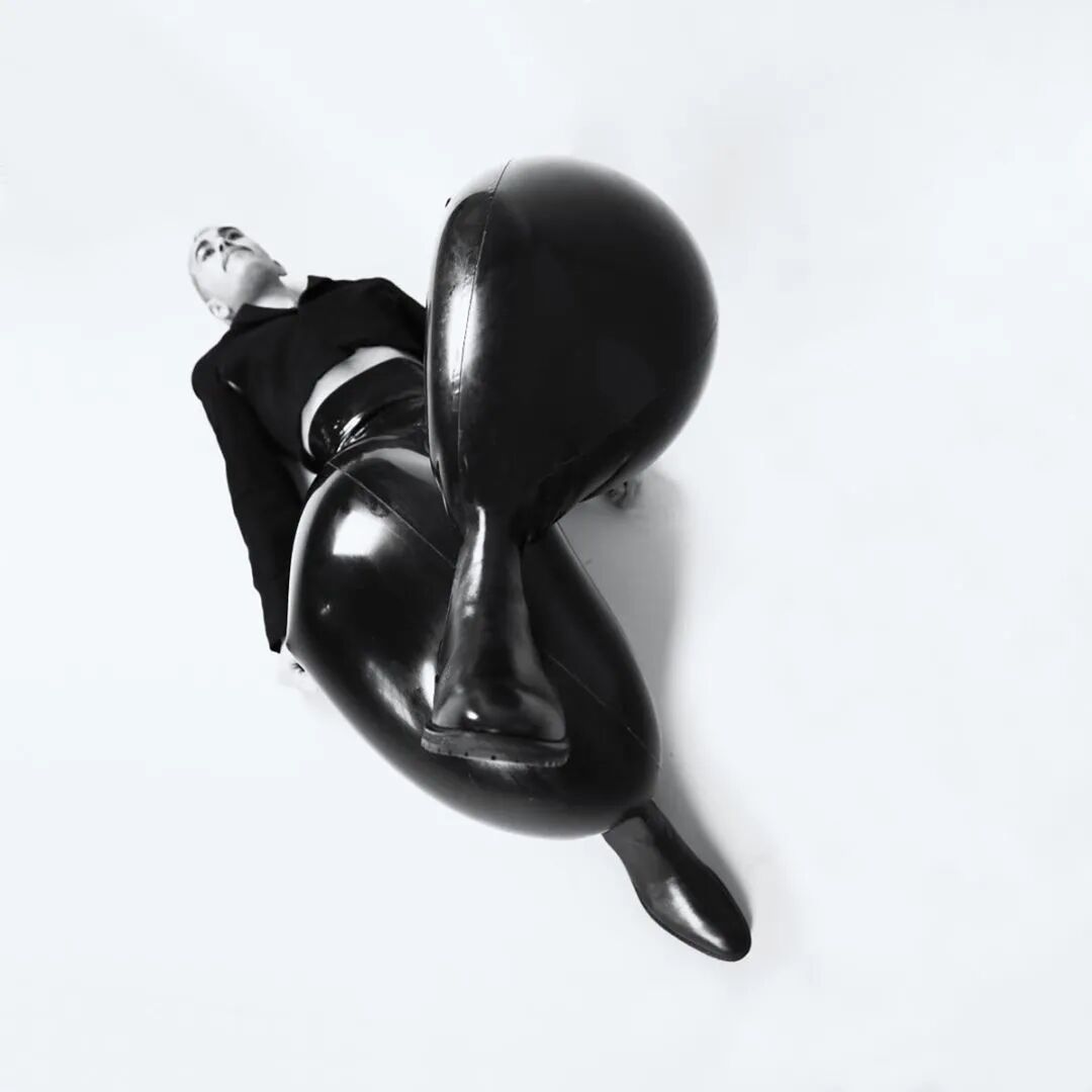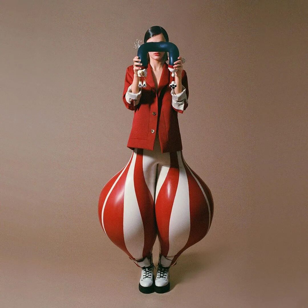 这种夸张的乳胶充气裤每个都由多达30个单独的乳胶裁片,并耗费48个小时来制作完成,这些裁片可以是纯白色,也可以是砖红色,又或是墨绿色薄荷绿色。颜色之间的对比突出了扭曲感。通过仅有7毫米宽的充气阀向裤子中充气以膨胀成如此夸张宽度的充气裤
