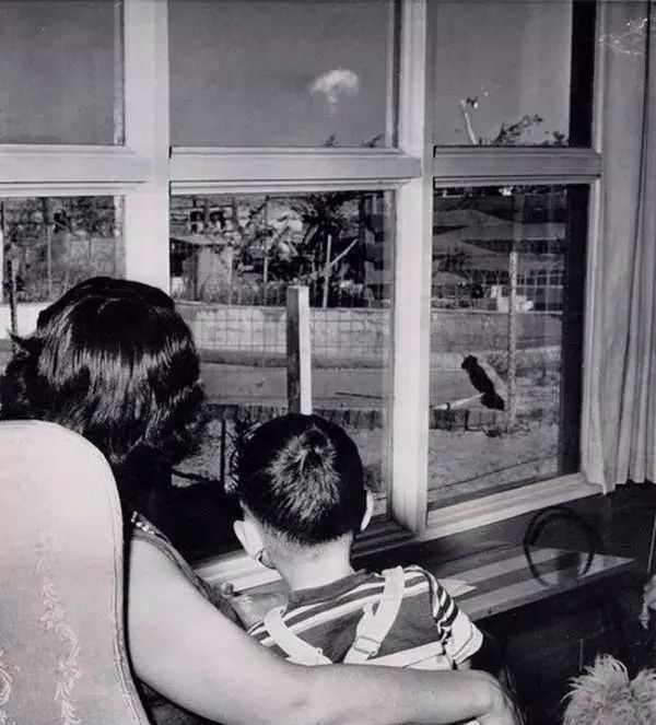 内华达州的一对母子在观看核爆后冉冉升起的蘑菇云。嗯,我知道你们想起了布鲁斯·班纳。