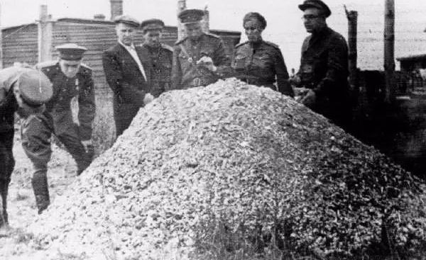 一群苏联士兵站在波兰的麦丹尼克(Majdanek)集中营,望着那座堆积如山的骨灰。