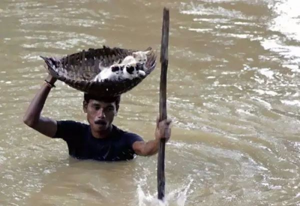 在印度洋海啸过后,一名男子救出了困在水中的三只小猫。