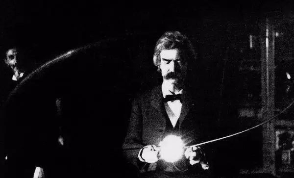 马克·吐温在特斯拉的实验室兴致勃勃地玩耍,后者在一旁饶有兴致地看着他。巨头们诠释了什么是文理不分家。
