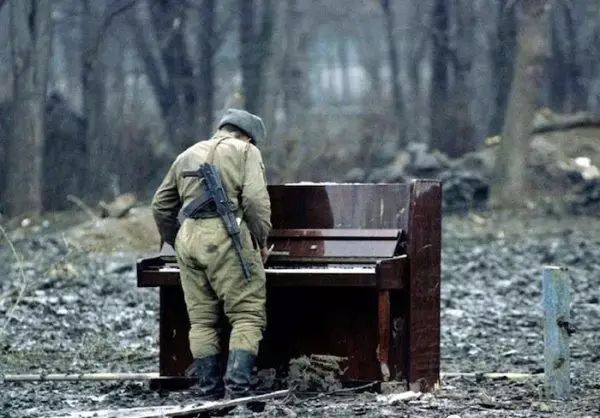 现实版的《钢琴师》。1994年的车臣战争中,一名俄罗斯士兵在弹奏废墟之中的钢琴。