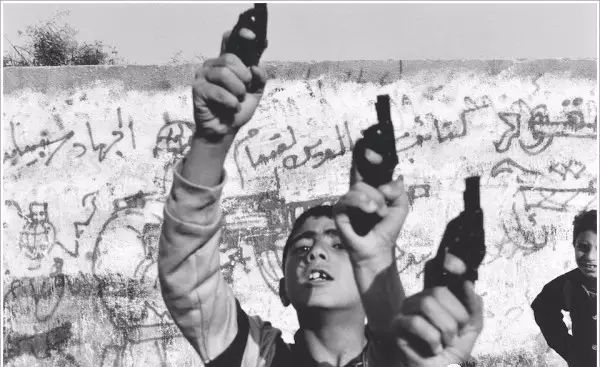 1993年,一群巴勒斯坦孩子拿着玩具枪挑衅巡逻的以色列军队。