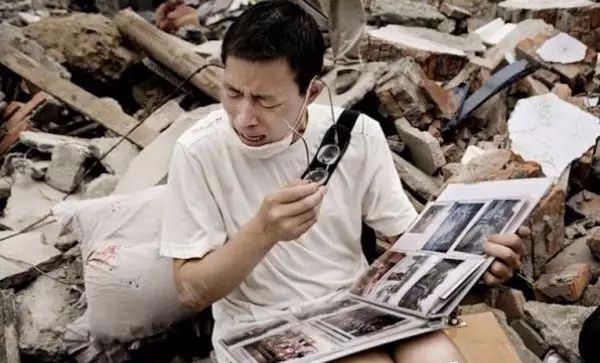 2008年,汶川地震过后,废墟中一位男子看着家人生前的照片,泣不成声。