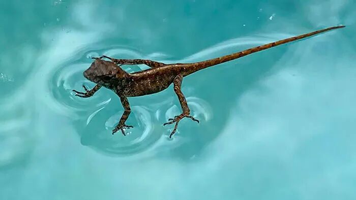 我发现这只蜥蜴“站在”我游泳池的水面上
