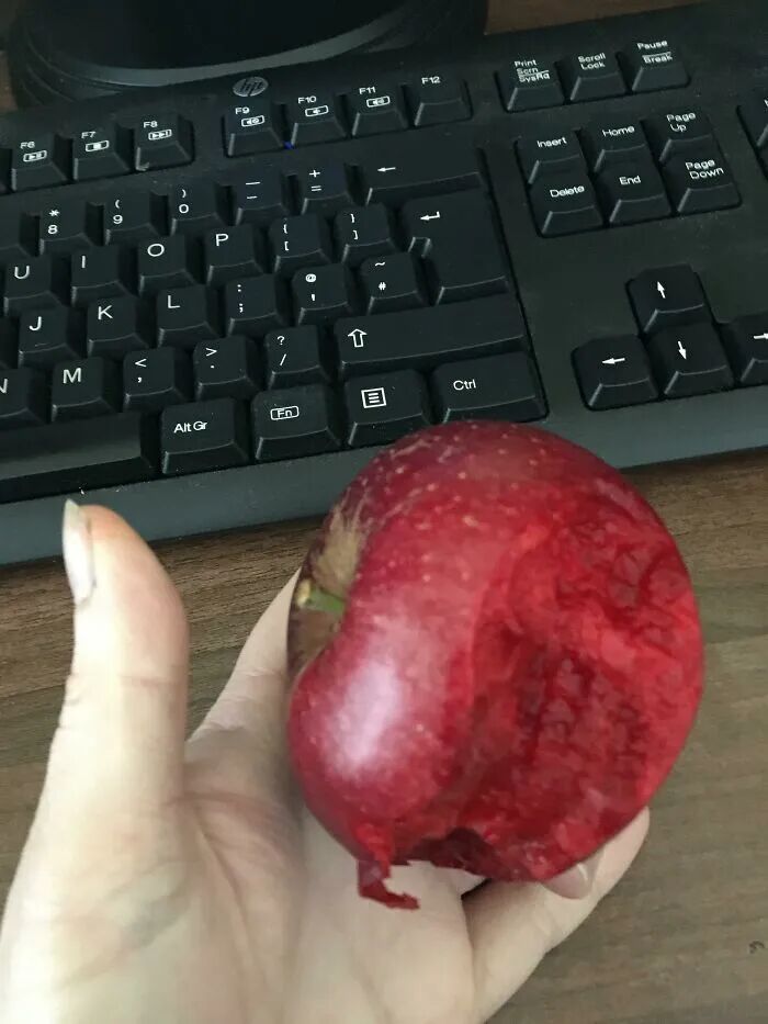 这个苹果的果肉和它的皮肤颜色一样