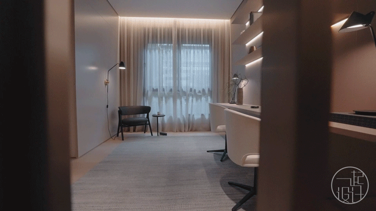 独立的书房为住户提供了一处安静的家庭办公环境,墙面三排书架底部均设长条型光源,颇具现代感。
