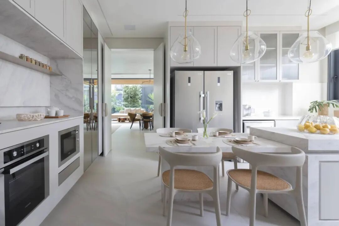 餐桌对面的白色双开门后方还加设一间独立的家庭式餐桌厨房,打开门后与阳台景色保持视线连通。