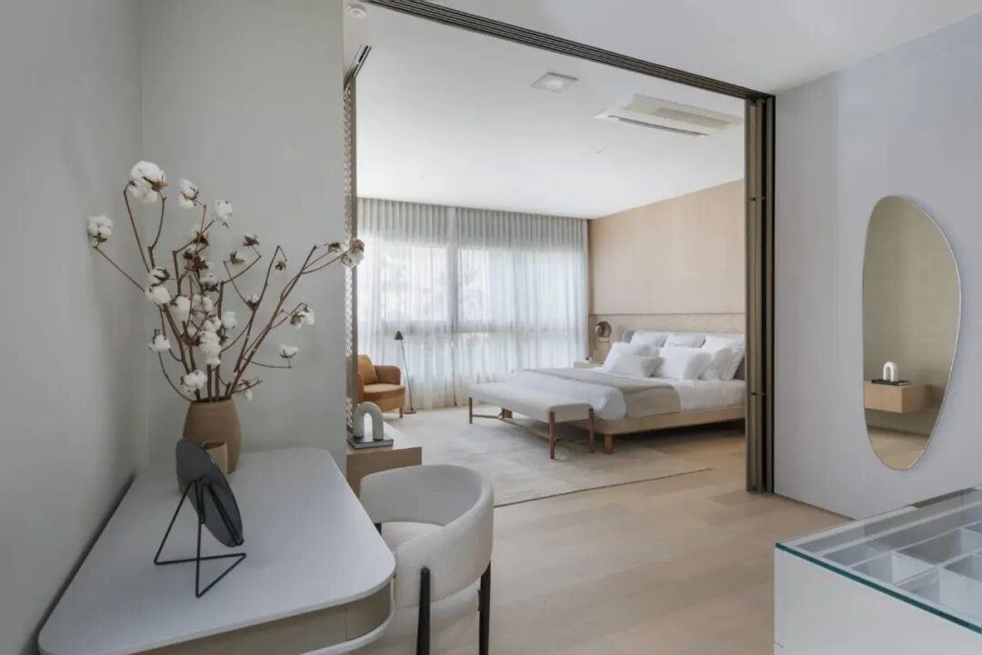 每户公寓均拥有四间卧室套房,各自设有卫浴空间,其中主卧房还有一间独立衣帽间,室内装饰采用中性色调和天然涂料为主,大框架移门引进入充足自然光。