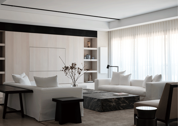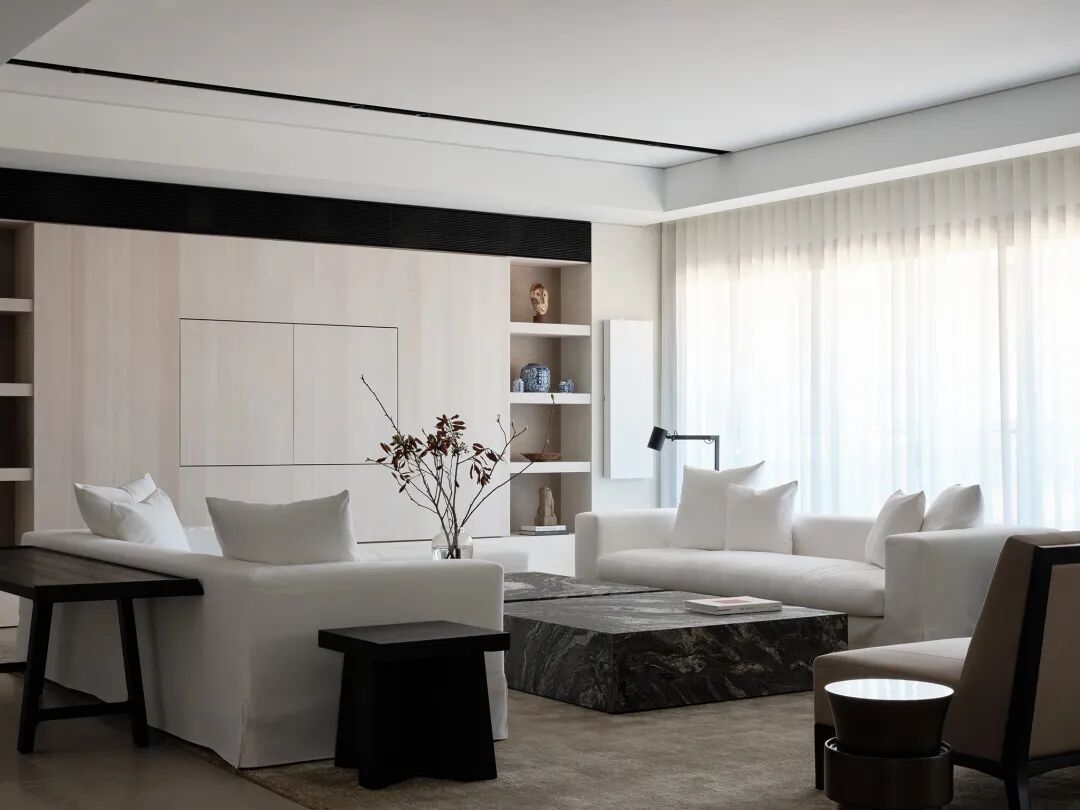 客厅配有定制大理石咖啡桌和Maxalto Simplex F 沙发。原木色的电视背景墙将电视机很好地隐藏了起来,将杂乱程度降至最低。