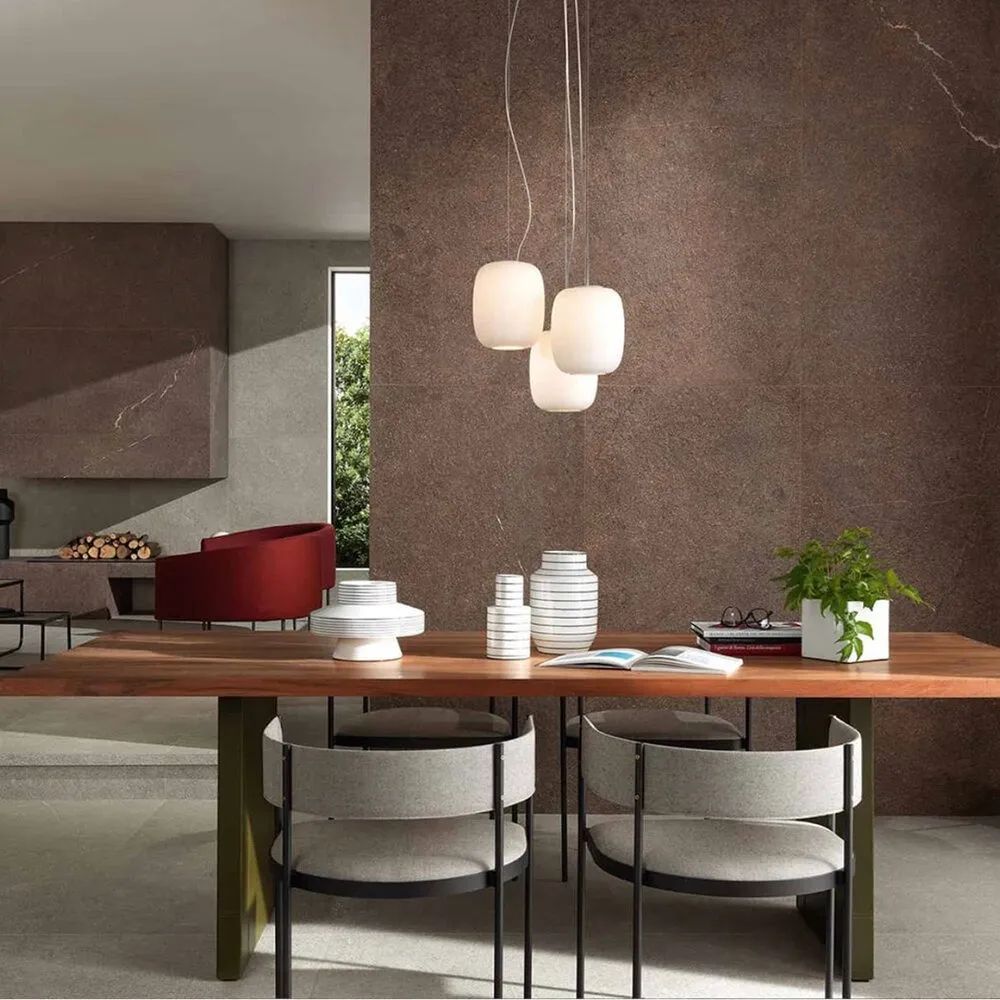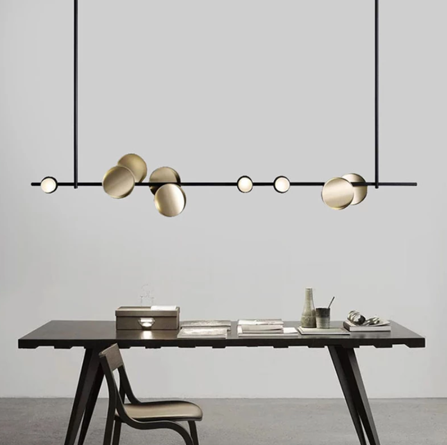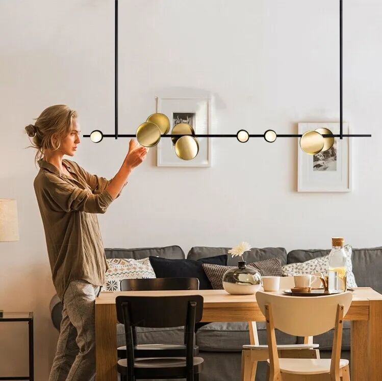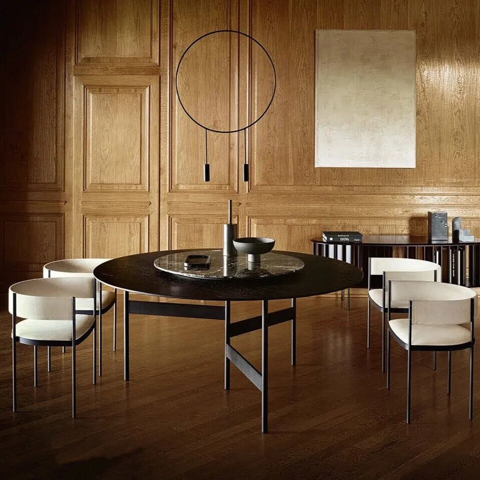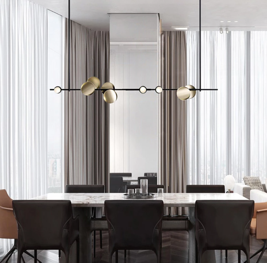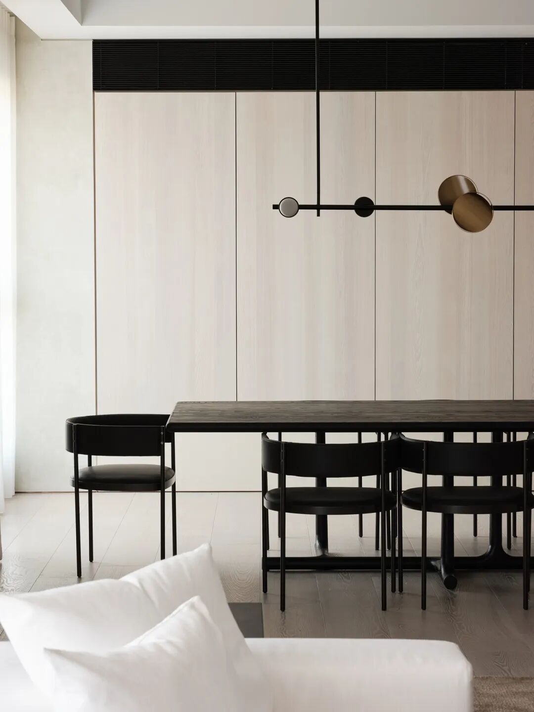 Rakumba Typography 吊坠位于用餐区上方,作为雕塑附加物,将视线向上吸引。灵活性是家庭空间规划的关键,可以允许大型和长时间的聚会。黑色系餐桌搭配黑色椅子,别有一番氛围。