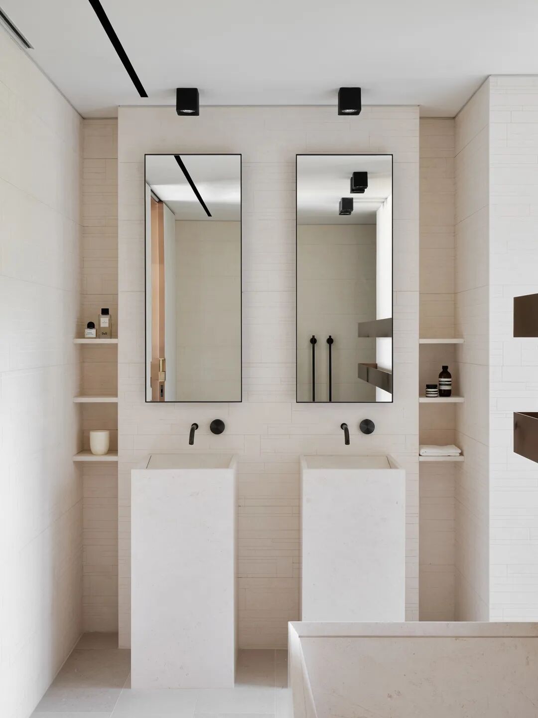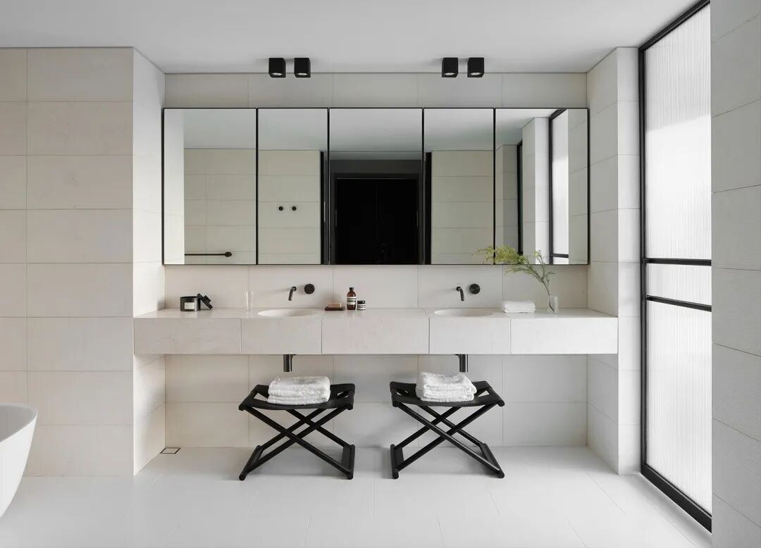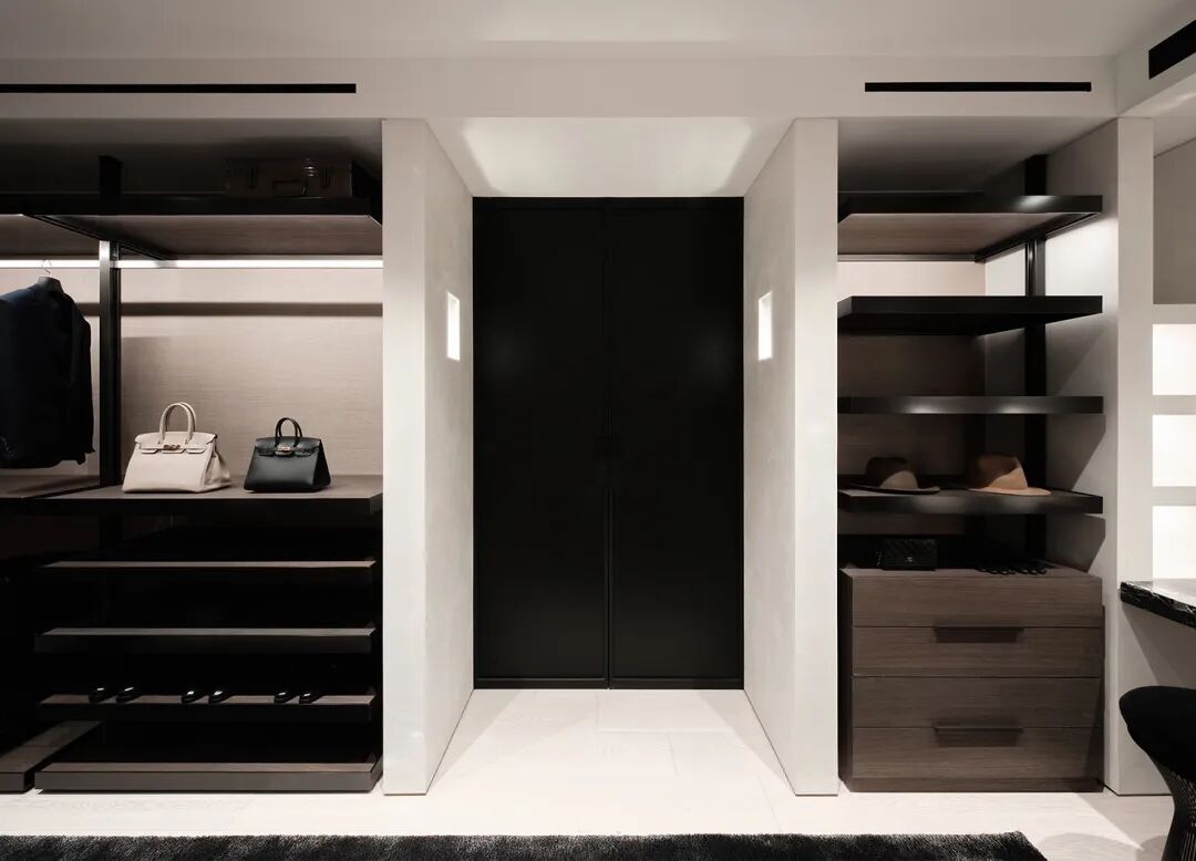 镜面角落设有Living Divani Nina 凳子。大理石台面连接着两侧的衣柜,充分利用了空间。