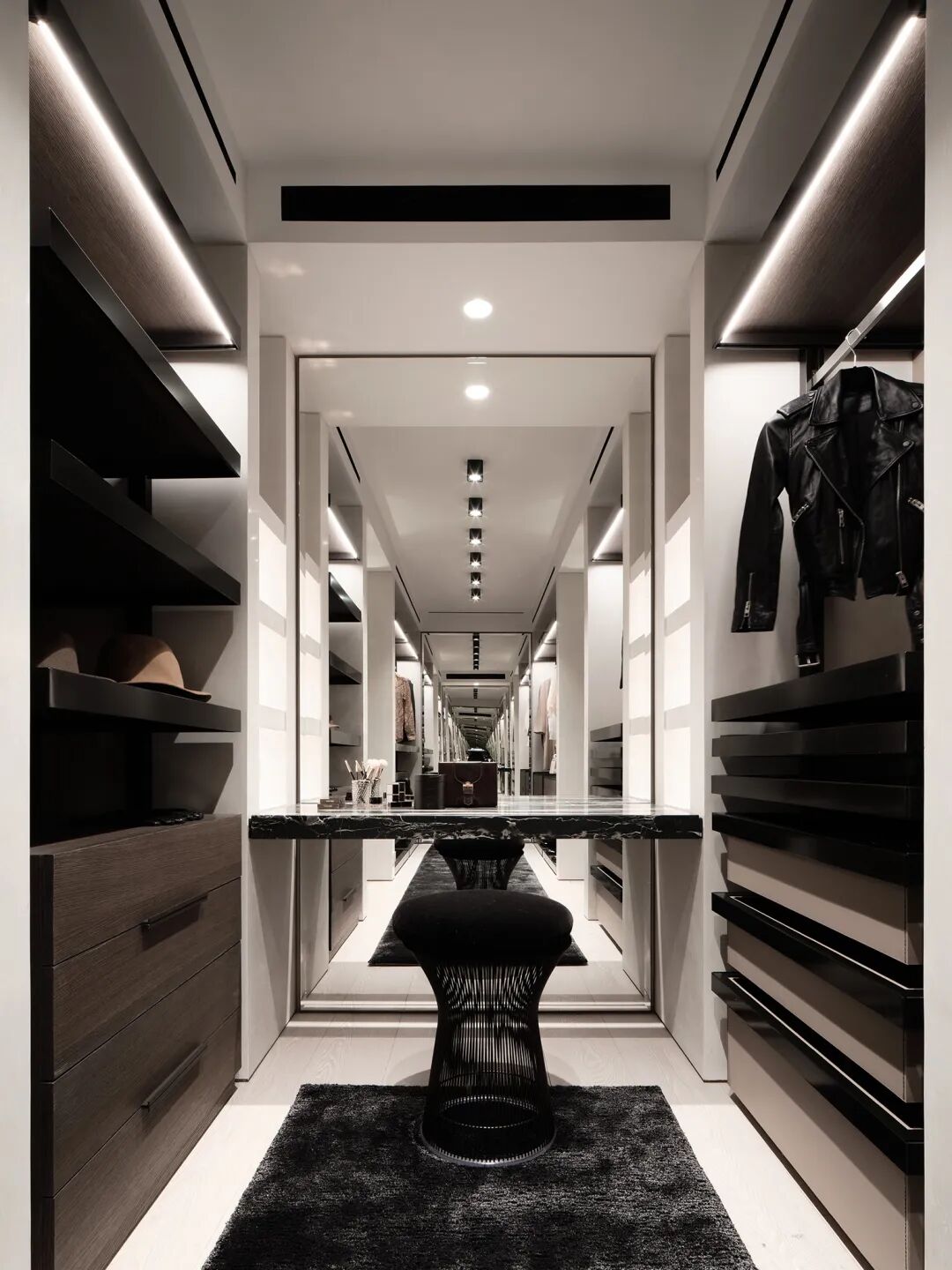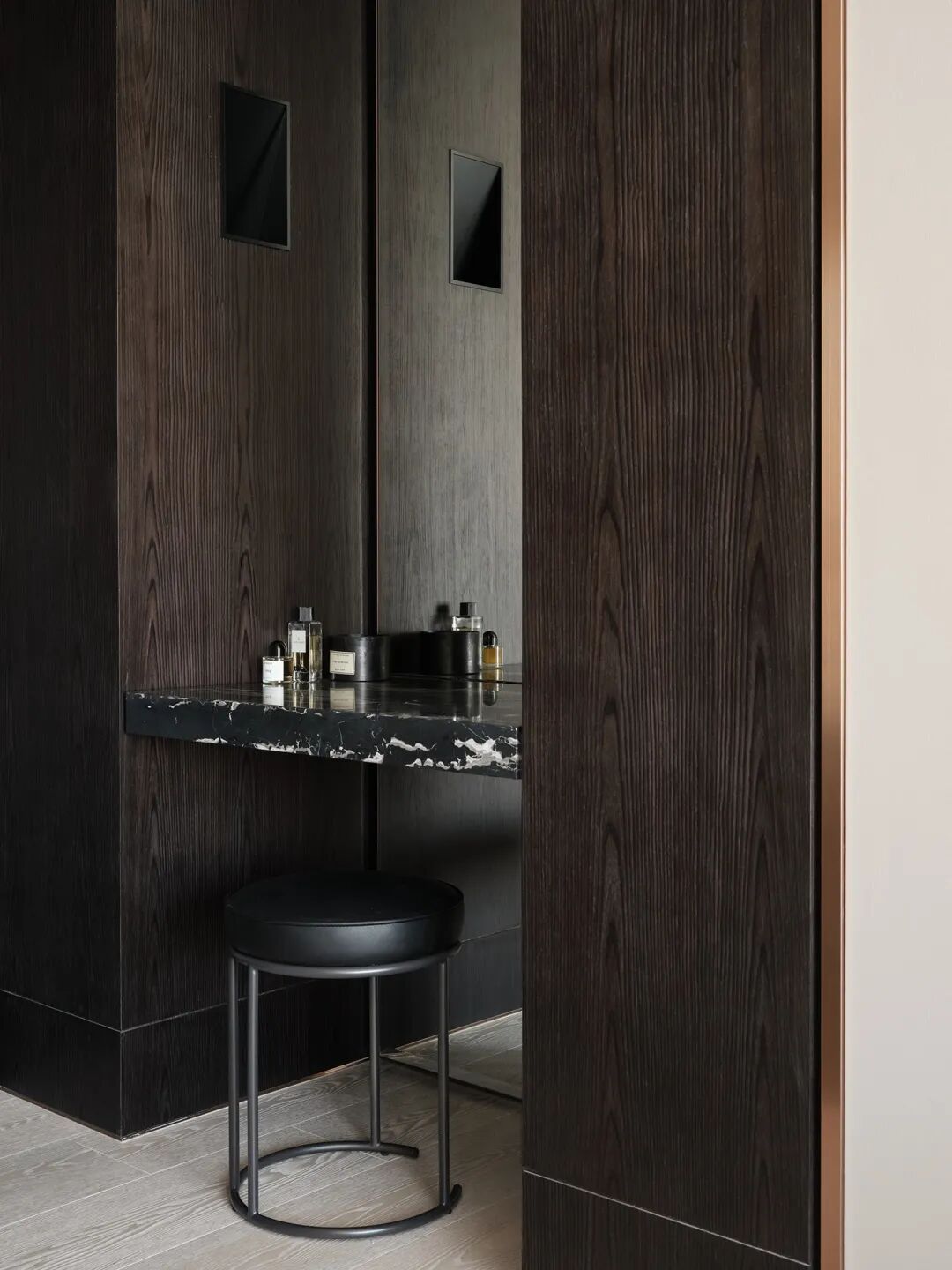 另一角落,一面巨大的穿衣镜印入眼帘,视觉上放大了衣帽间。Knoll Platner 凳子、散色的暖光射灯,温暖的木地板,综合了室内的冷意。