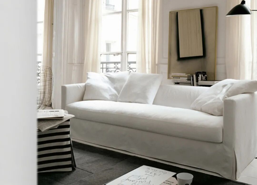 由 Antonio Citterio 为 Maxalto 设计的 Simpliciter 沙发。配有薄扶手,营造出轻盈的美感。有两种尺寸可供选择。