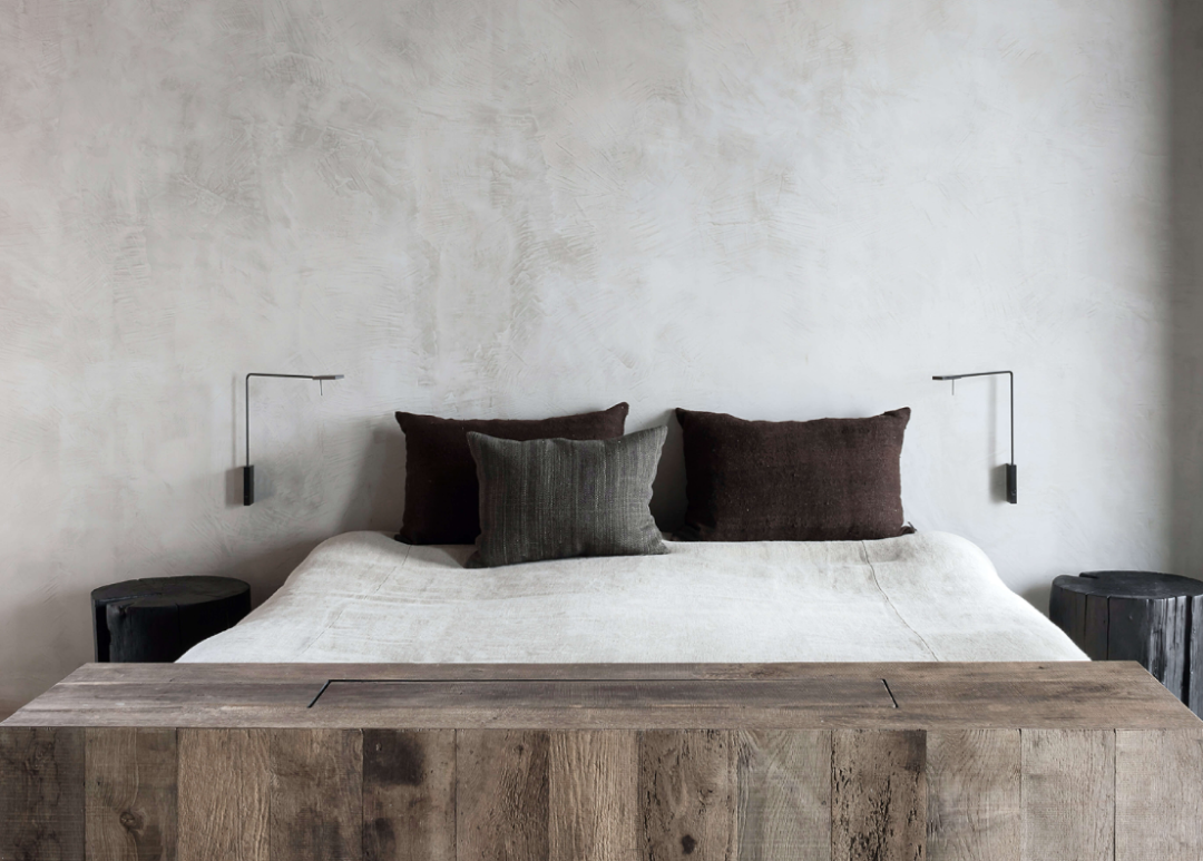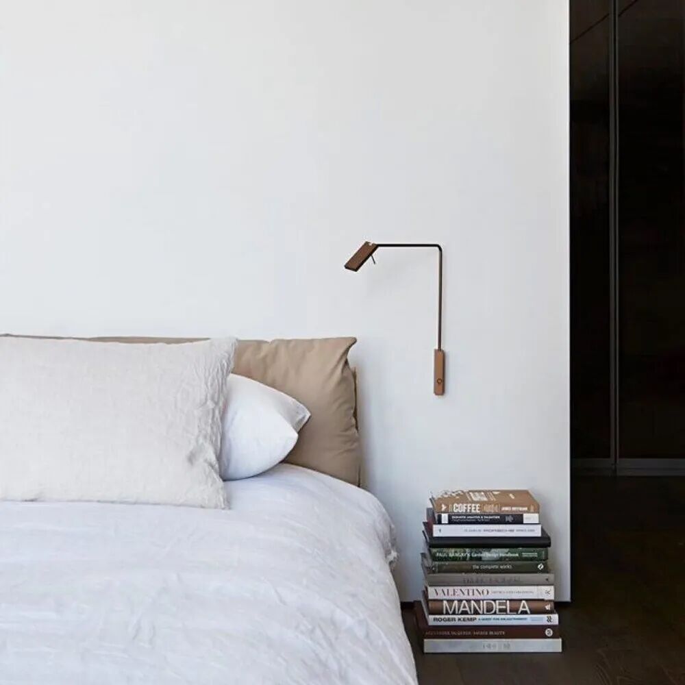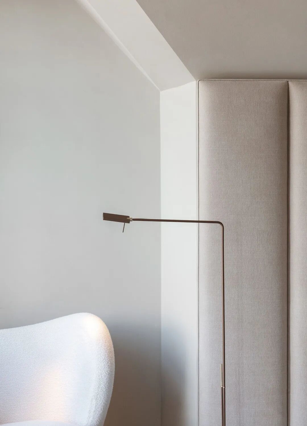 次卧室配有Viabizzuno Roy 壁灯,线性元素的调色板和组合让卧室充满了一种自然和有机的感觉。