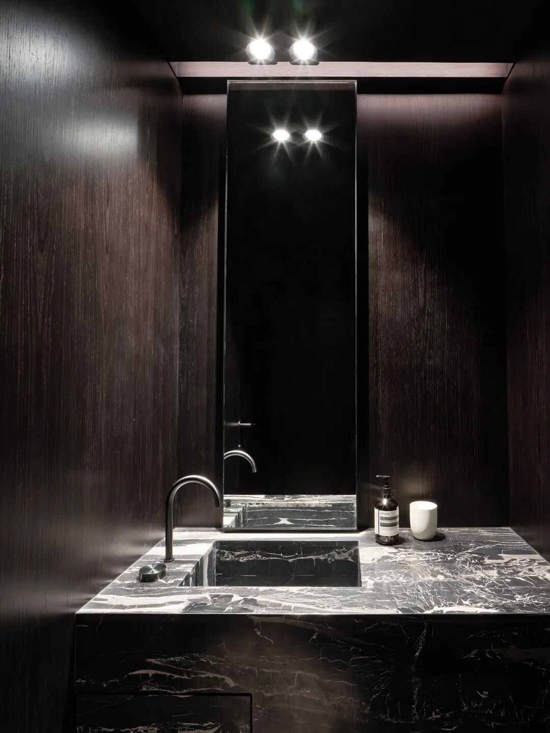 通过集成的细木工和厨房空间表达了木材和石头的黑暗和情感调色板 - 两者都是室内空间中收集和准备的地方。