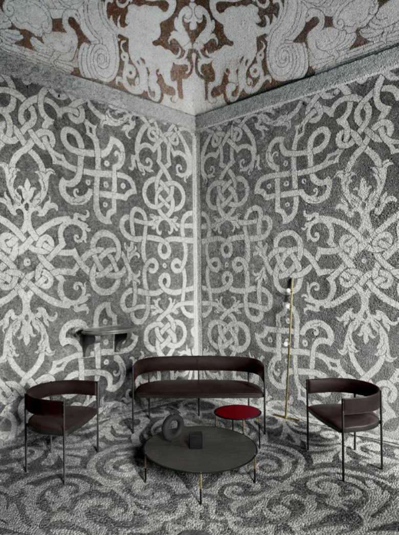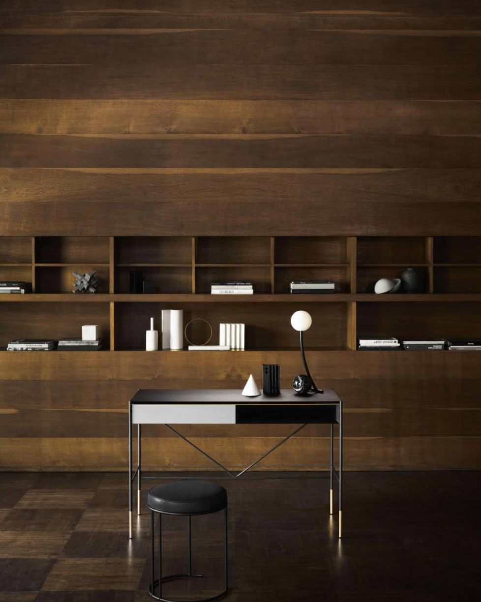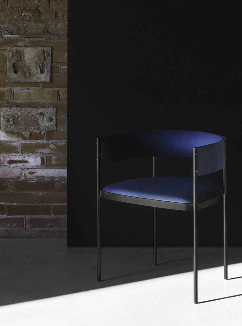 也保留了家族独特的轮廓,但改变了材料:压延钢板的软垫靠背、青铜色钢的框架和座椅,展示了相同想法的多种变化。