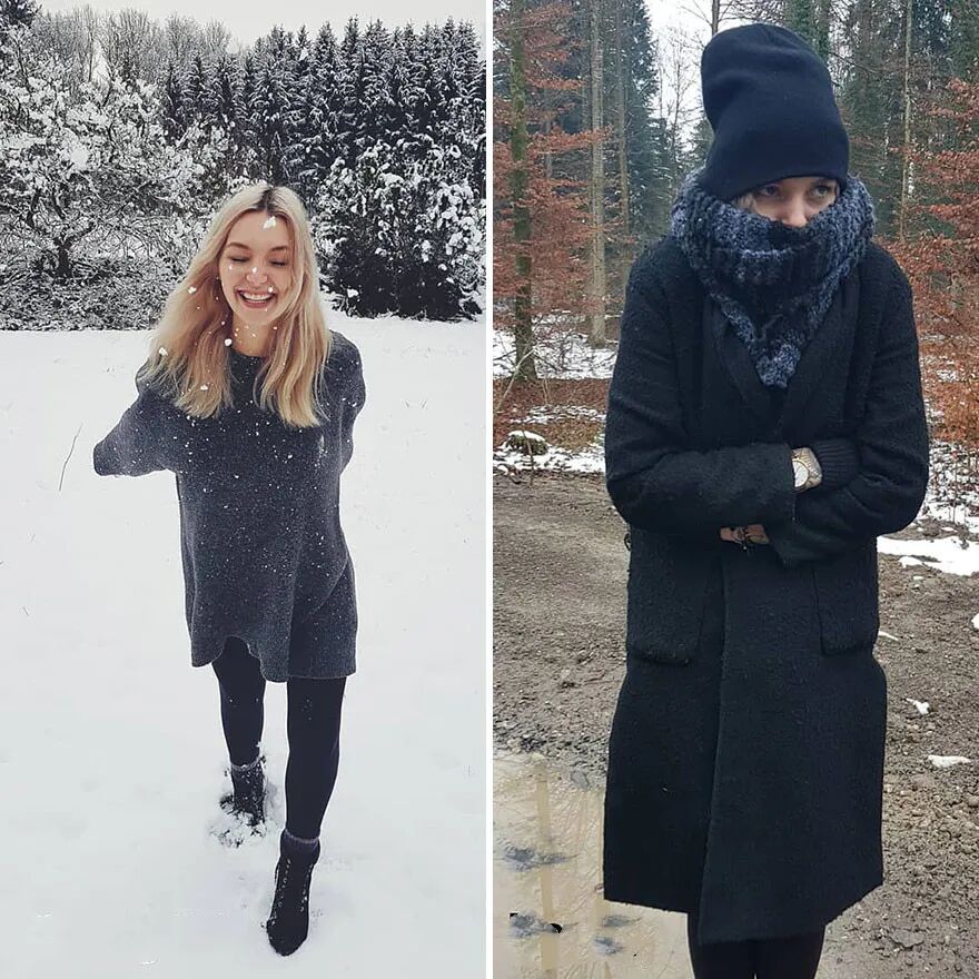 美女打扮漂亮的在雪中玩耍。其实拍完恨不得把自己全部裹起来。