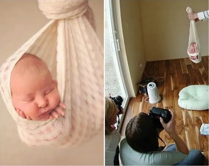 新生儿悬挂在毯子上,为了保证他的安全,下面有好几个垫子。