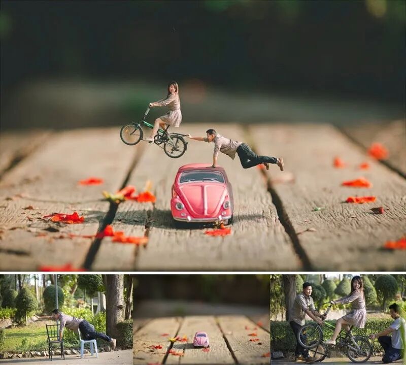 小人国照片,其实是用人物照和微距照合成的,挺有意思。