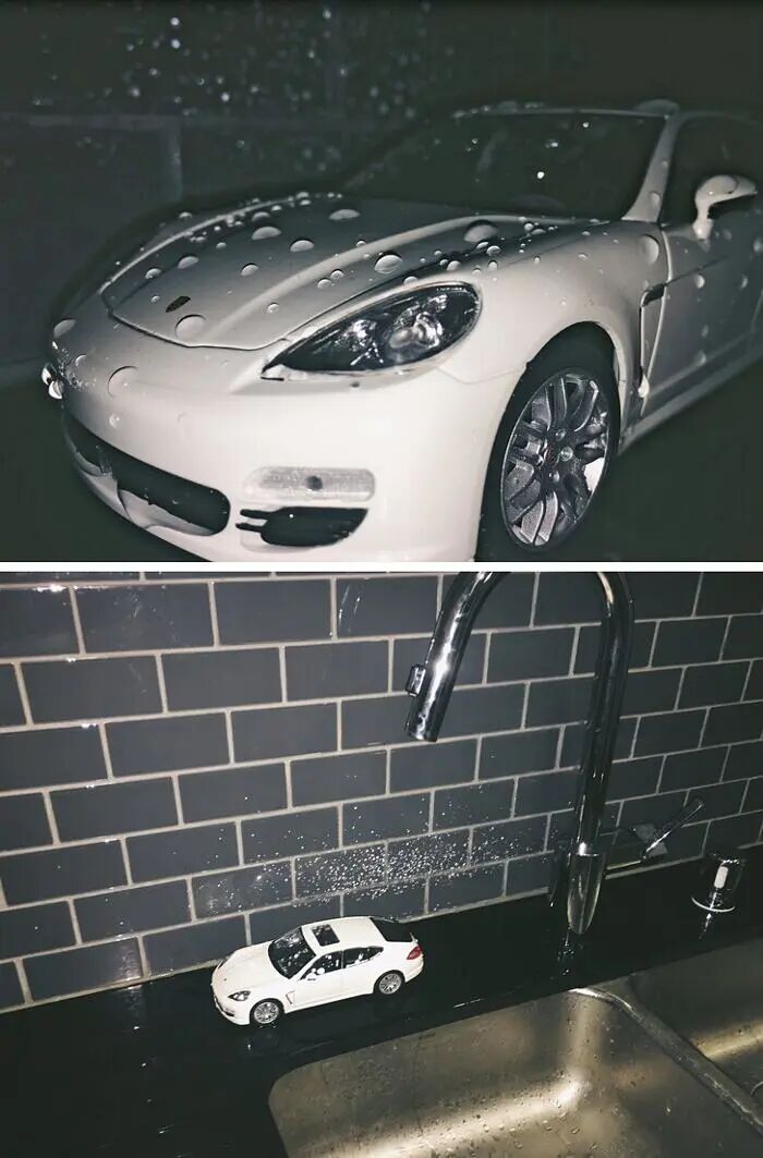照片里面没有雨也没有车,而是用水滴和模型营造的效果。
