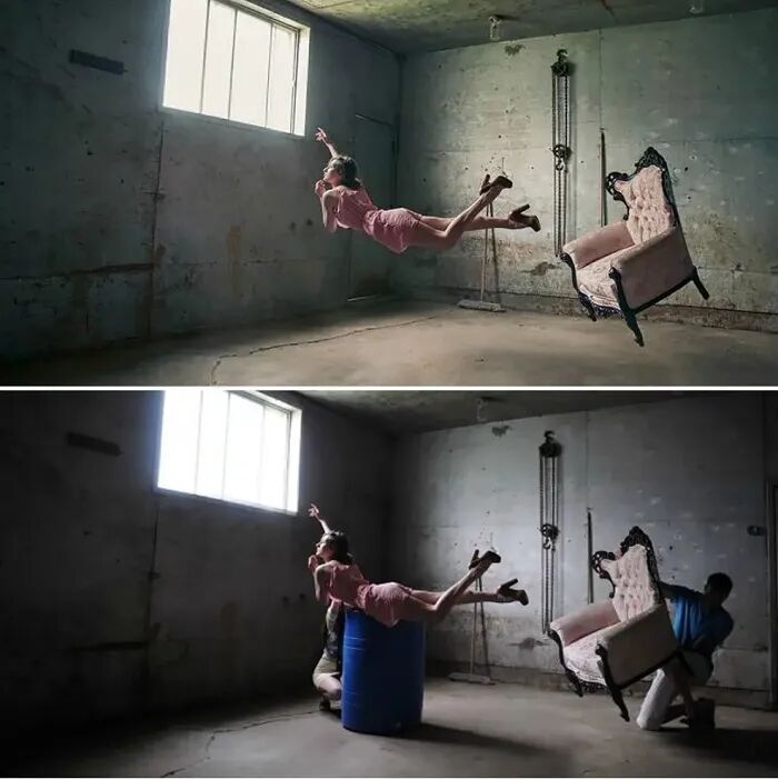 这是一张不可能的照片,真相是女人由桶支撑,沙发由助手扶起。