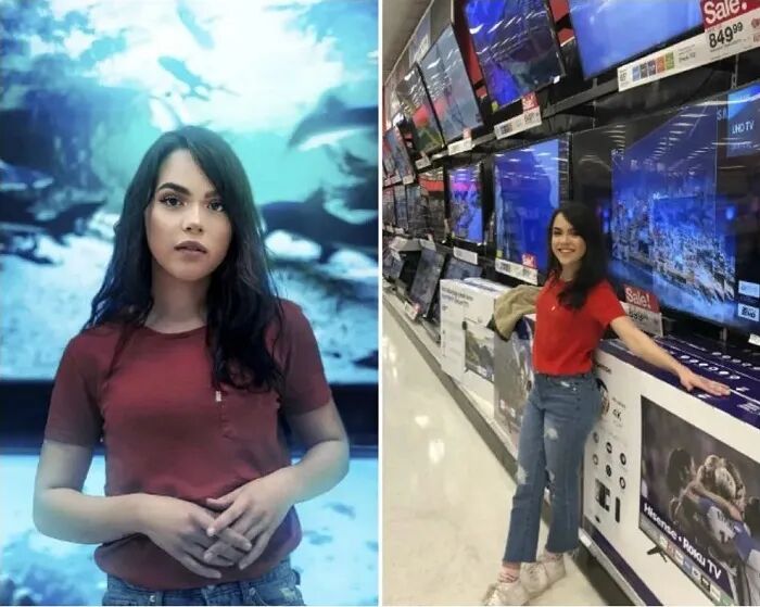参观水族馆,其实是运用电视做背景,这是很常用的拍摄技术。