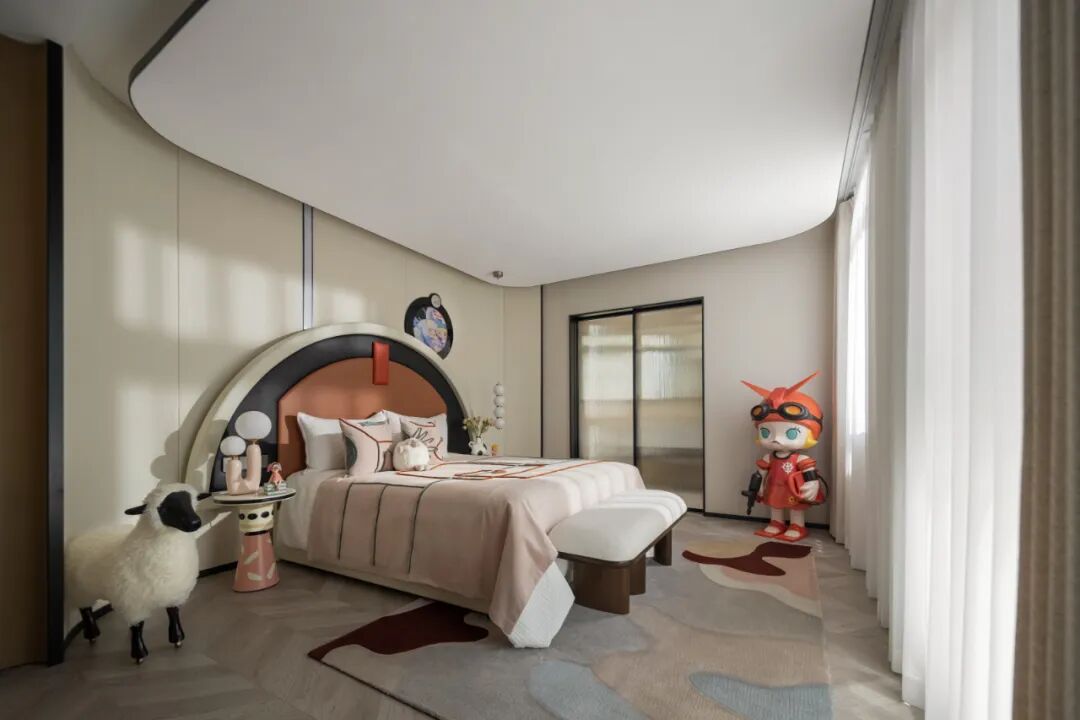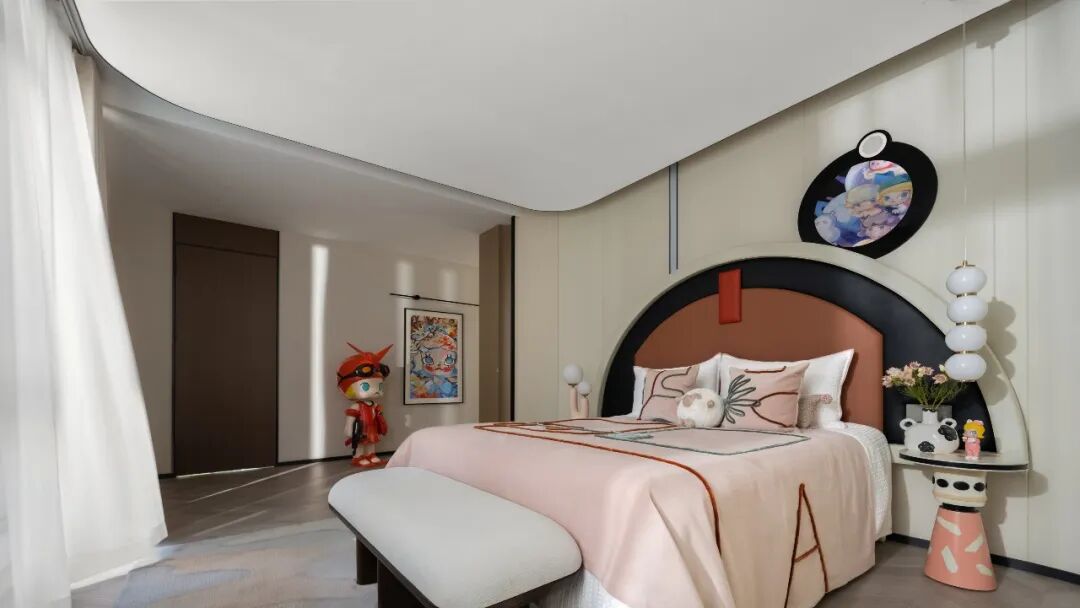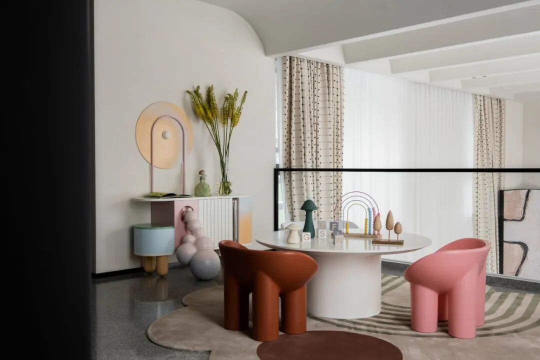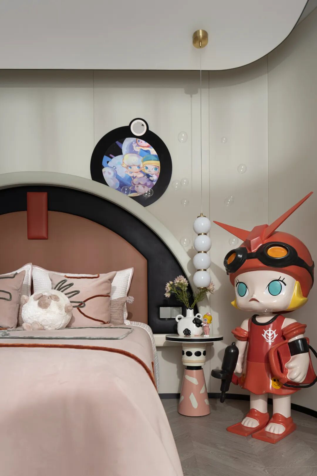 设计将精力集中在空间和陈设上,根据小公举的喜好,空间特意纳入泡泡玛特单品,让设计更加注重个性化定制,这里是缤纷的孩童世界,粉色之梦与自然之境的交织,体验一场沉浸式互动空间。
