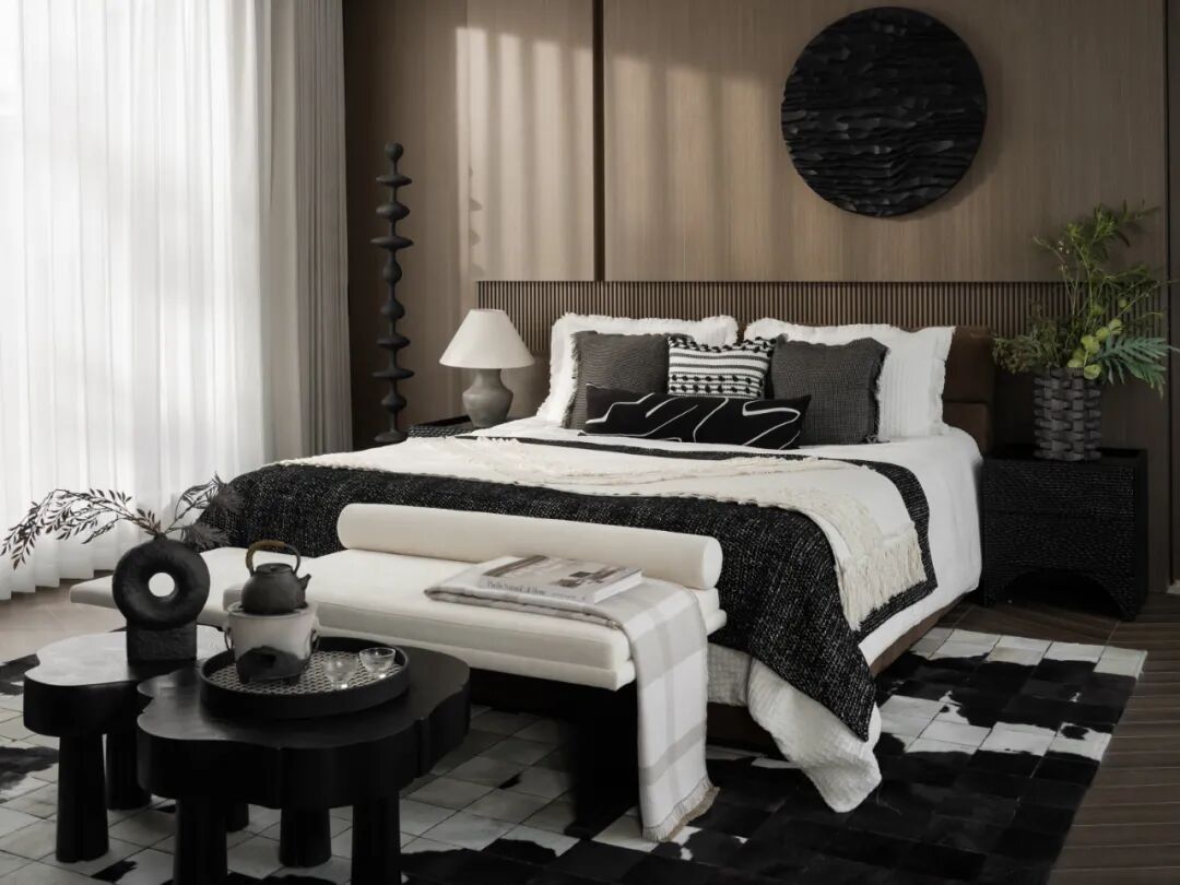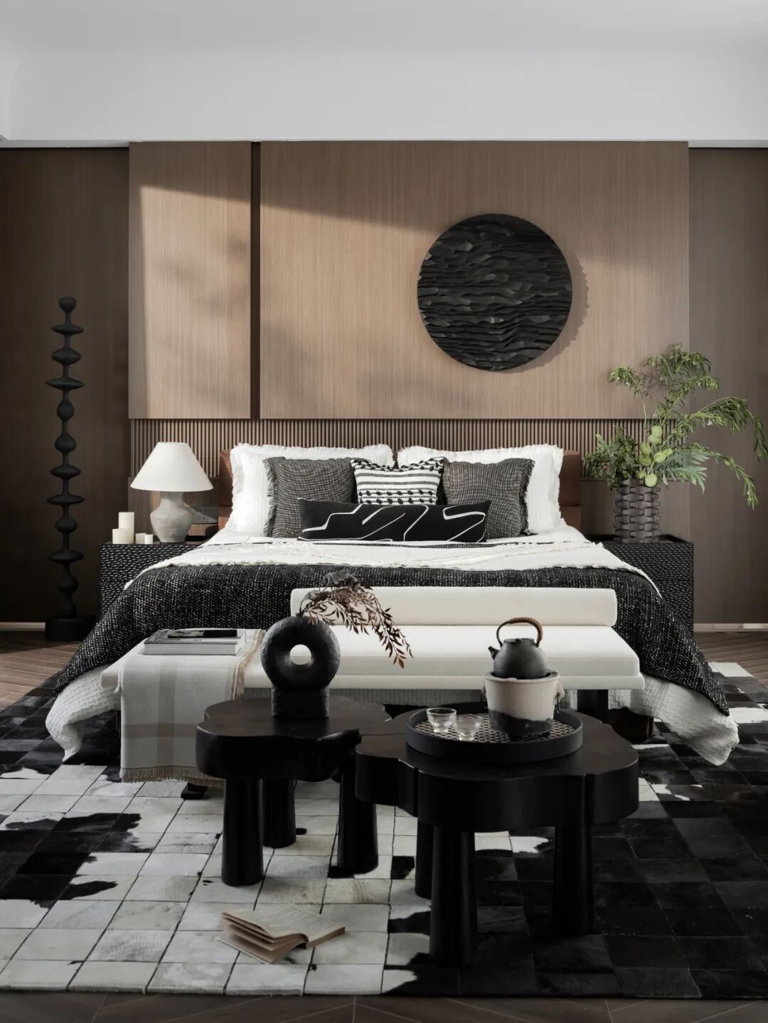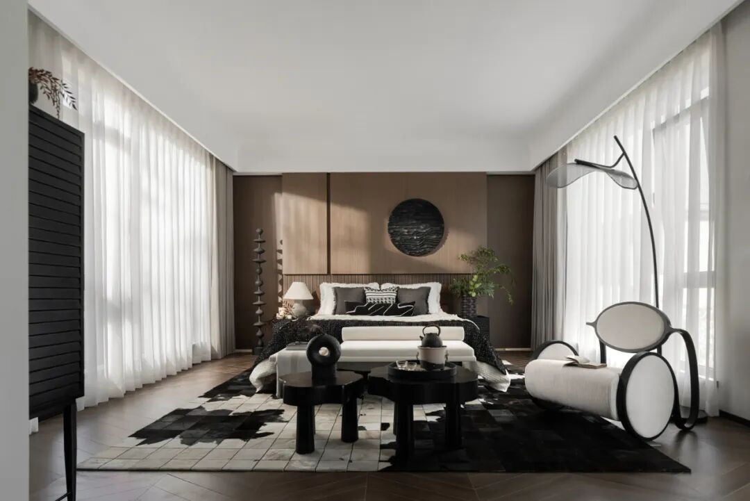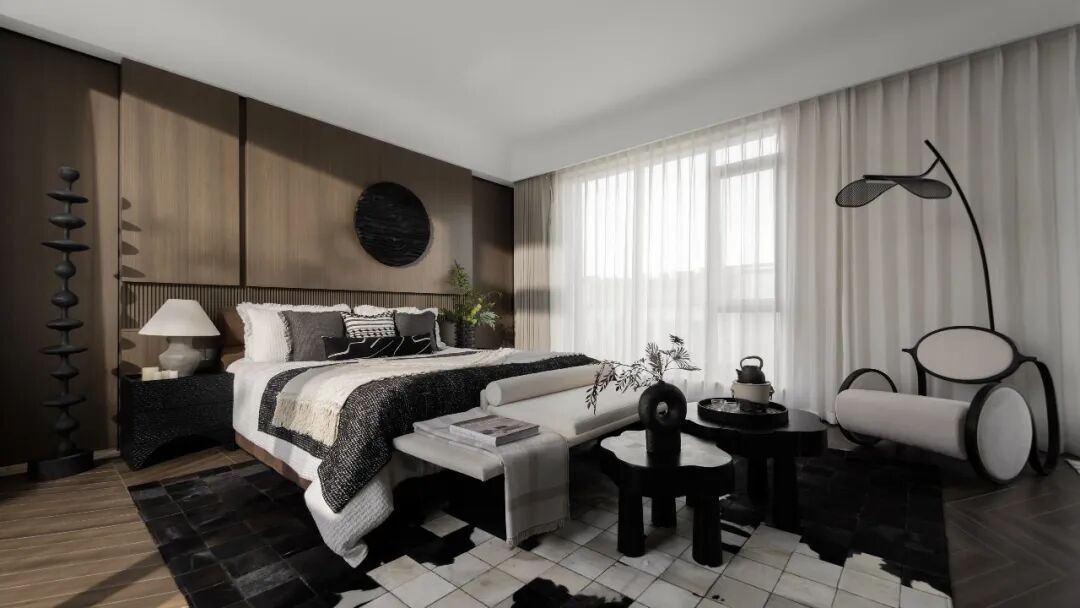 温润的肌理勾勒生活的律动,使空间理性且舒适,黑白灰的色调,家居品的简约,一一塑造了轻盈的空间质感,在木质的纹理和棉麻的床品的搭配下,完成对居者的表达。