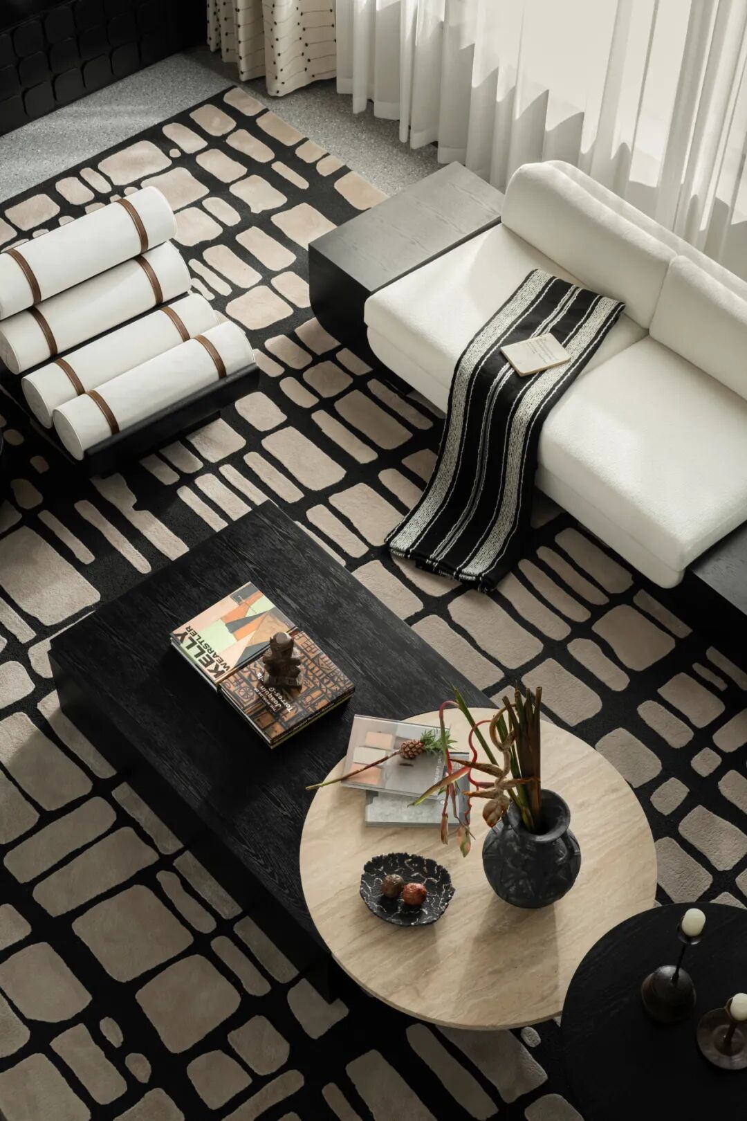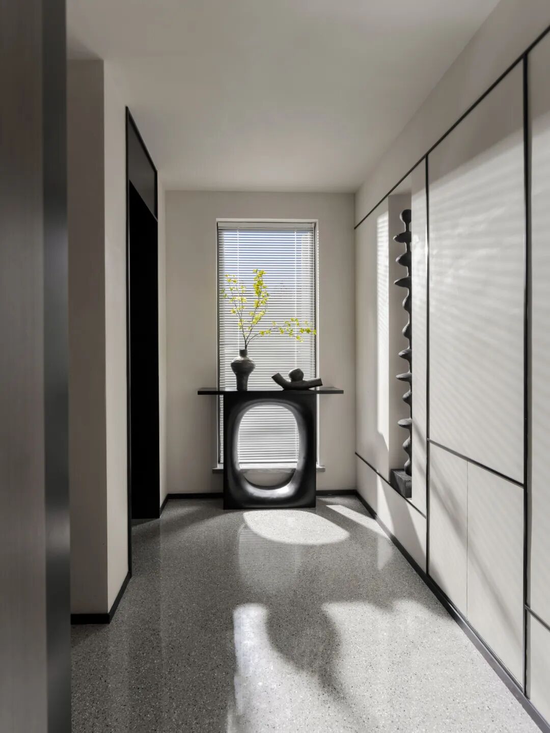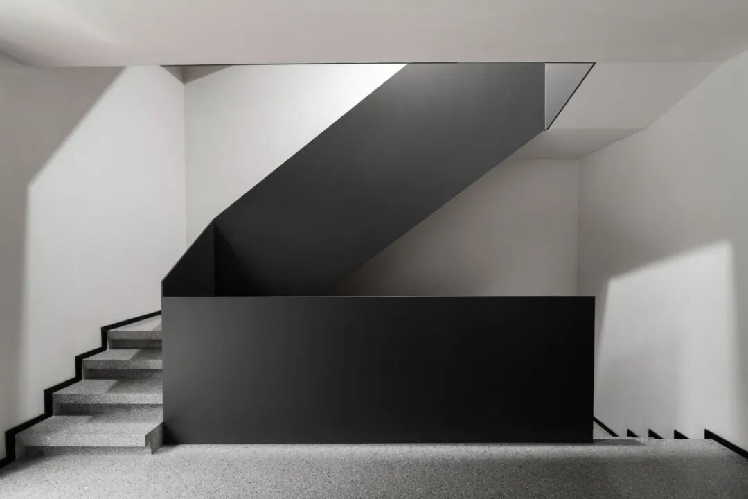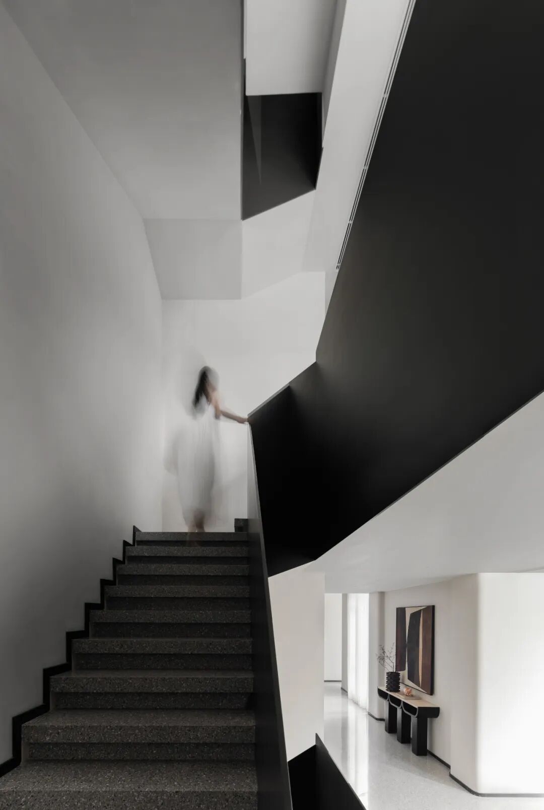 黑白相间的折线楼梯,具有很强的雕塑感和艺术性,尤其是踏步砂石颗粒,给人很强的视觉感,在两色世界里穿梭,像在两点之间拾步,走走停停的场景切换,如此厚重,如此闲适。