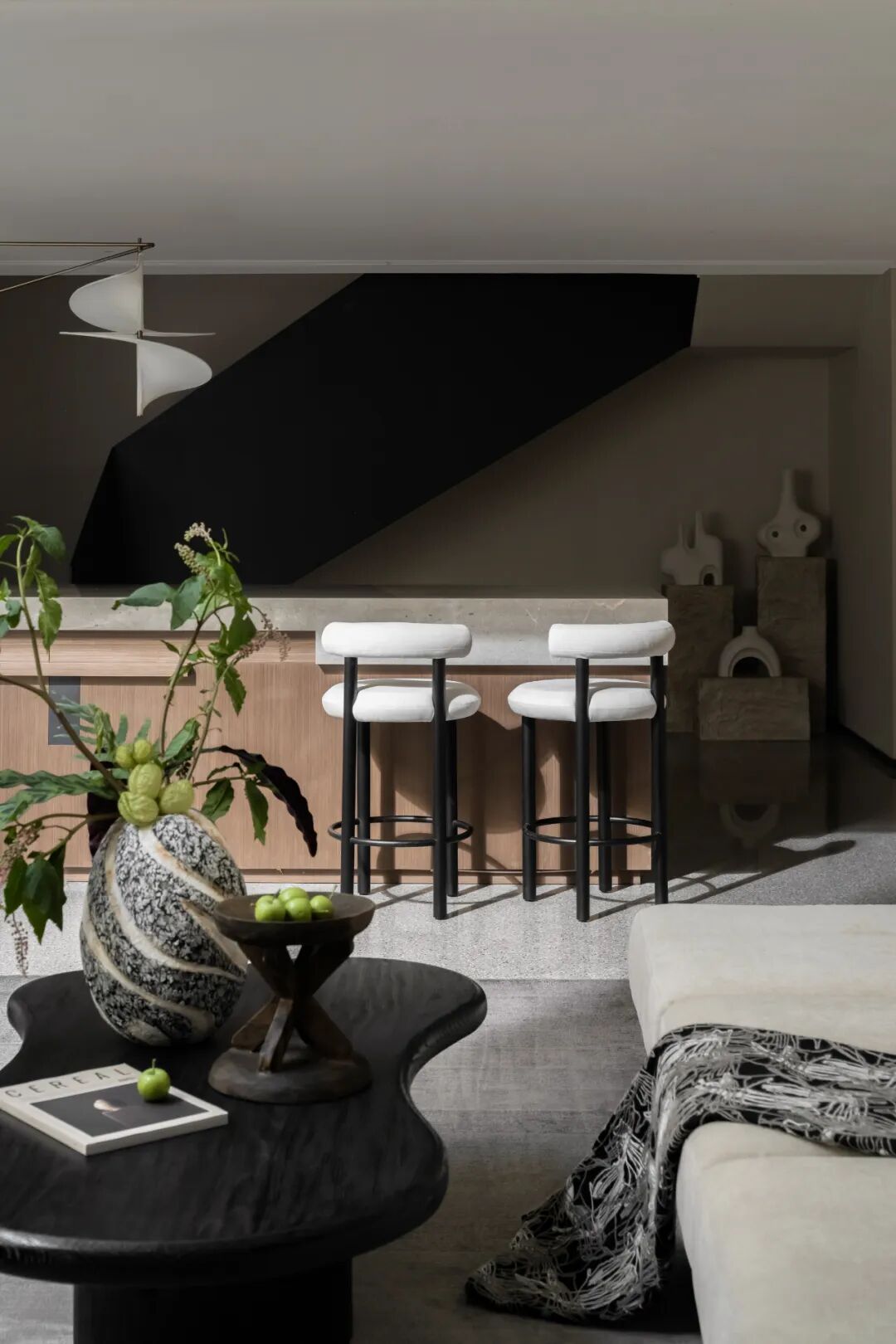 楼梯侧打造了一个水吧区,设计以人与空间的共鸣来考虑家具的选择和艺术的表达,简洁的现代吧台和吧椅,充满安静的力量,内涵和诗意在自然灵动的气韵中衍生。