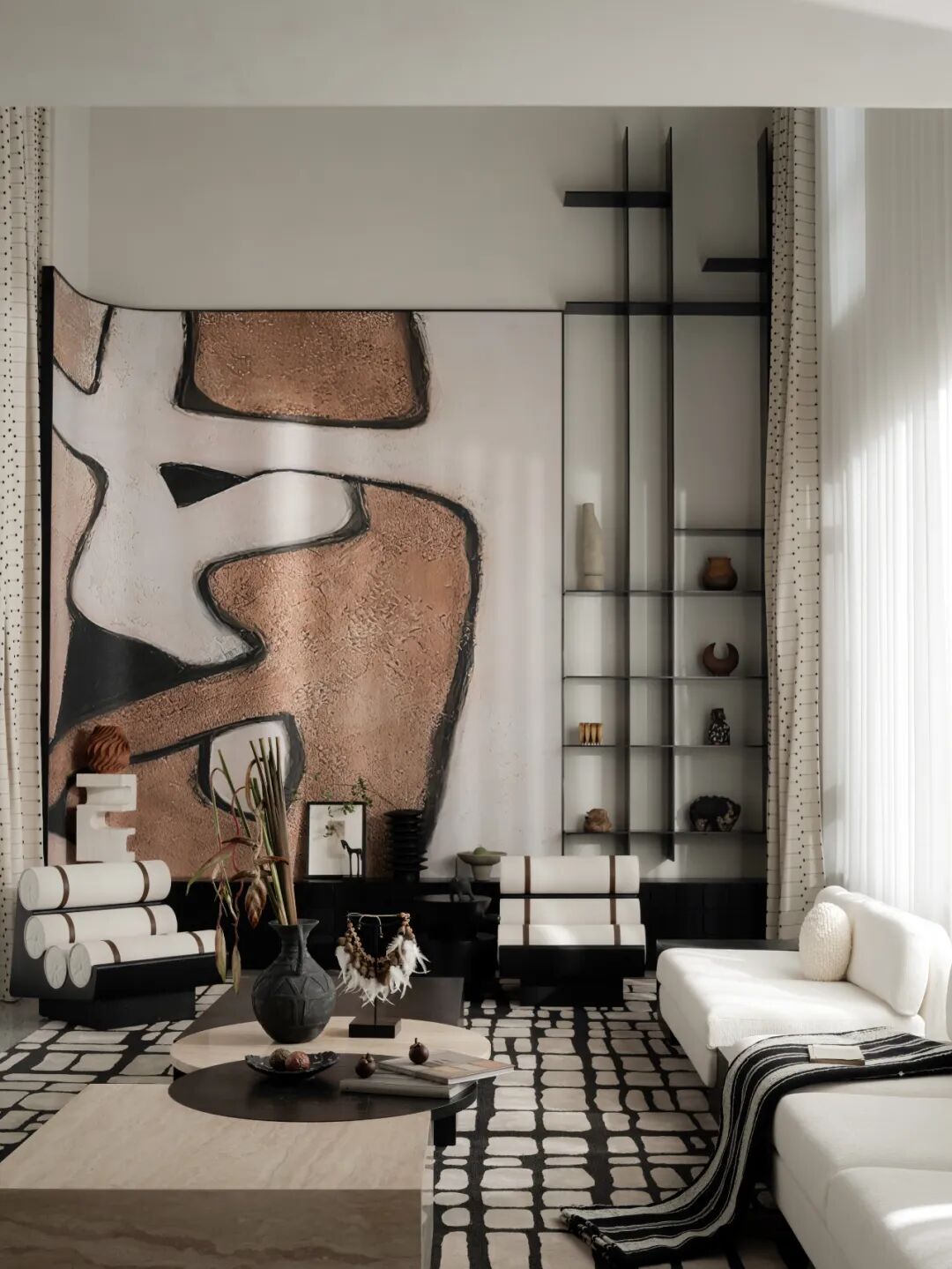 客厅在一抹流动熔岩的背景墙倾泻而来,这是自然的肌肤,也是当地的人文属性,设计以独有的交互逻辑,模仿西北苍茫大地的肌理,构建变幻的感知氛围,唤起从抽象转化到自然艺术的灵魂。