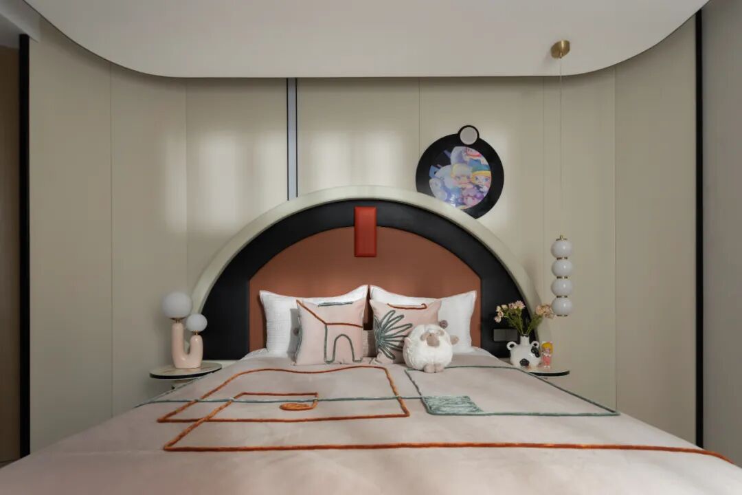 空间与自然在主卧开启一场叙事,交织的光影,细腻的色调在相融却不同的色系间涌动,不同色块的跃入,舒缓和解放居者身心的疲惫,营造出优雅静谧和抵达居者内心深处的港湾。