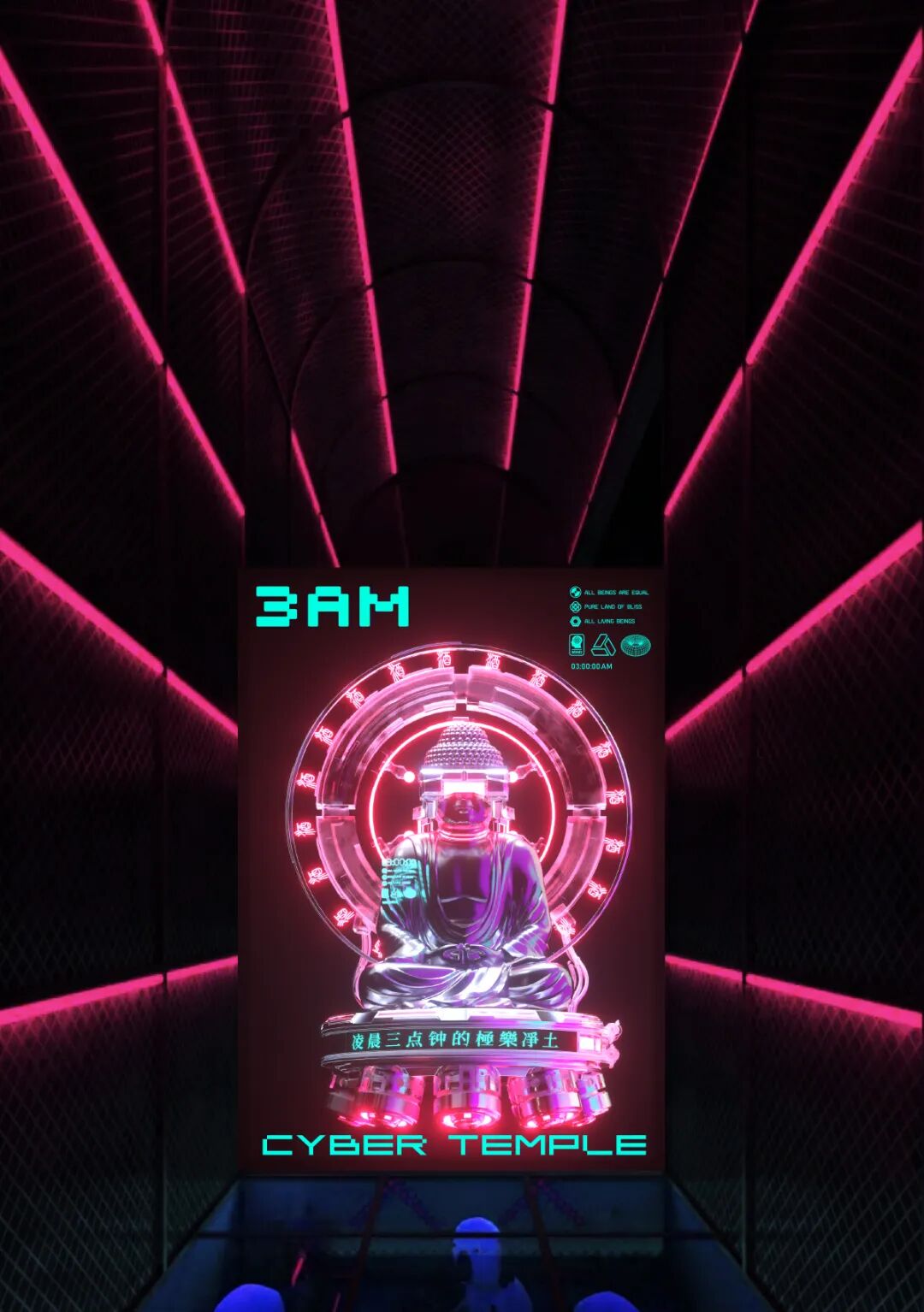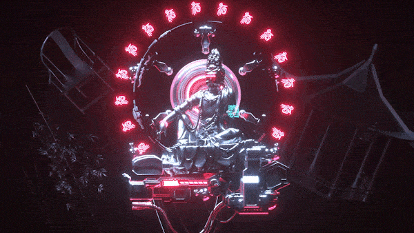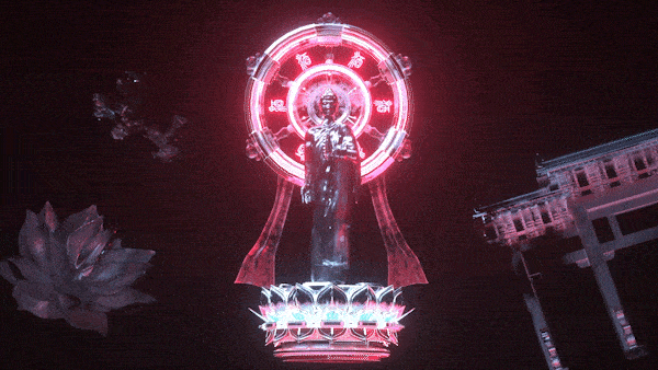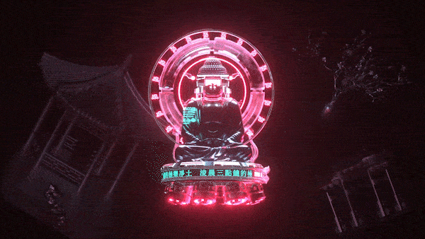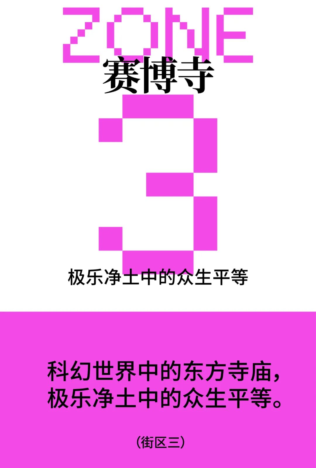 如果说第2街区,人们还在娱乐至死的红尘浮世,那么在第3街区,就是充满东方幻想与未来科技结合的极乐净土。高度发展的科技文明使人类显得渺小,人们变得边缘且性格孤僻,陷入“反乌托邦”的漩涡。我们打造一座极具东方风格的赛博寺,位列多尊机械佛为人们带来“众生平等”的美好。