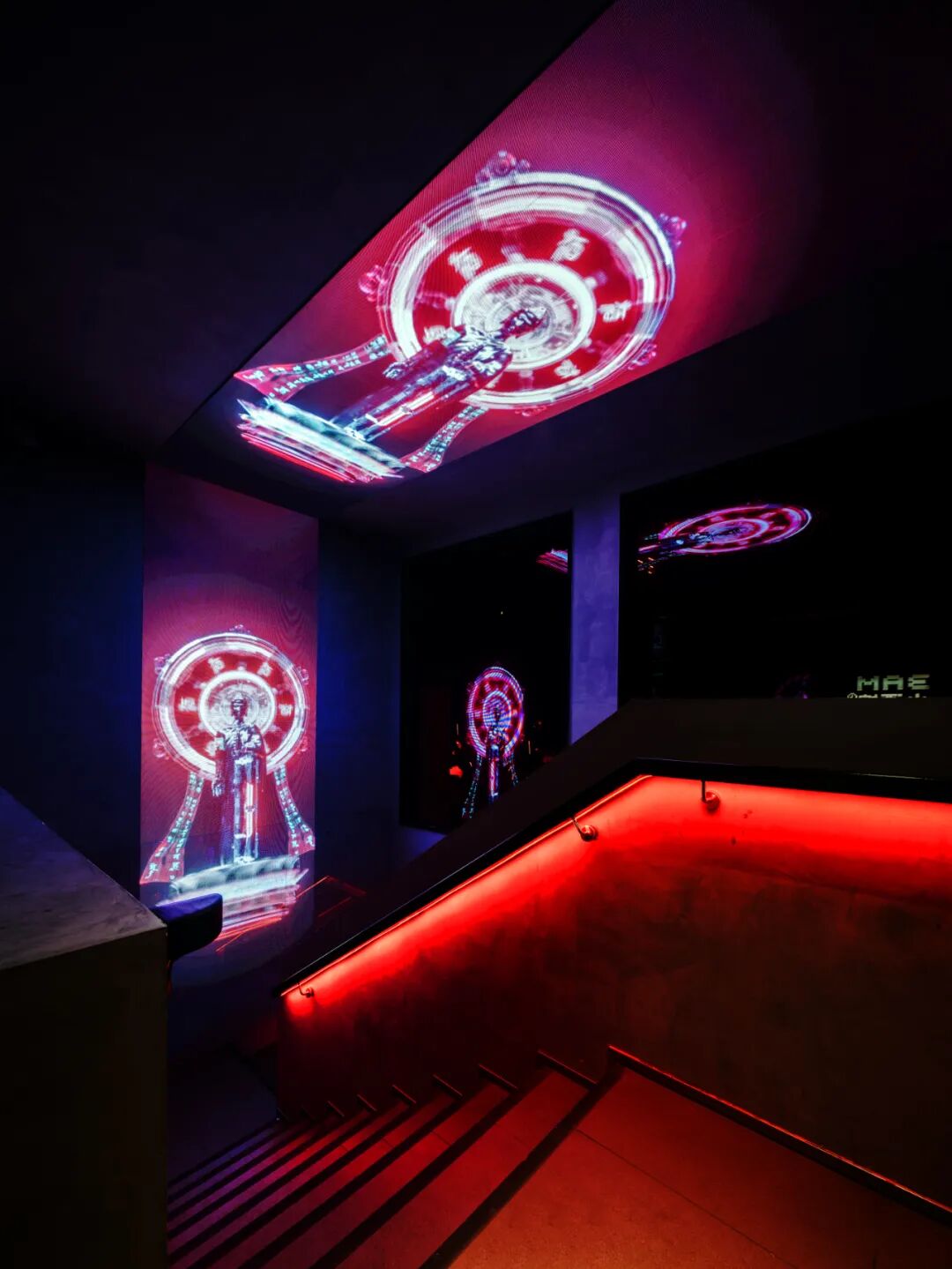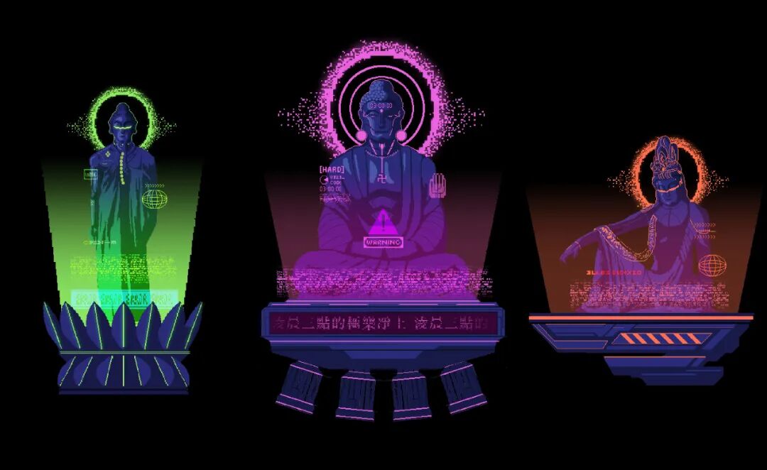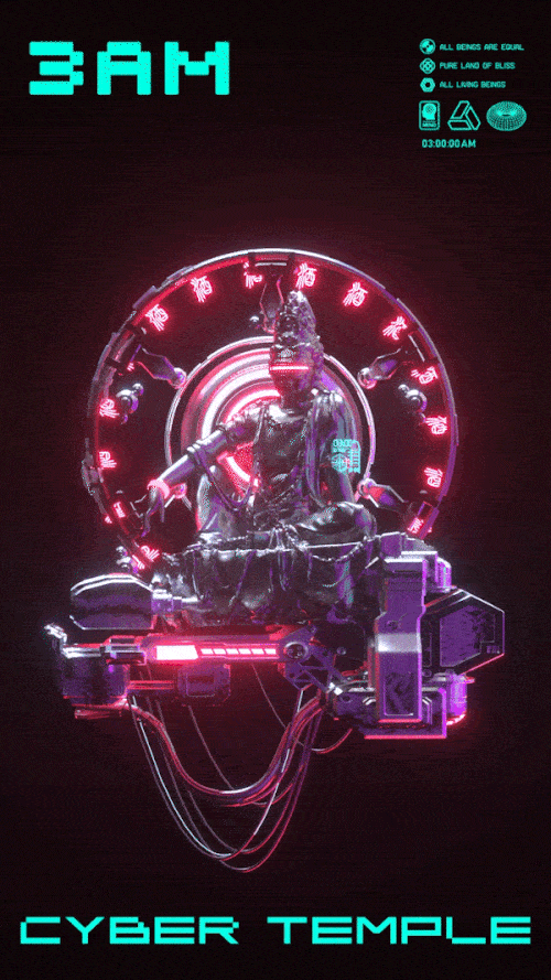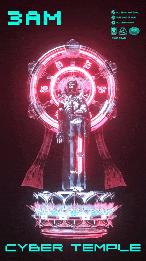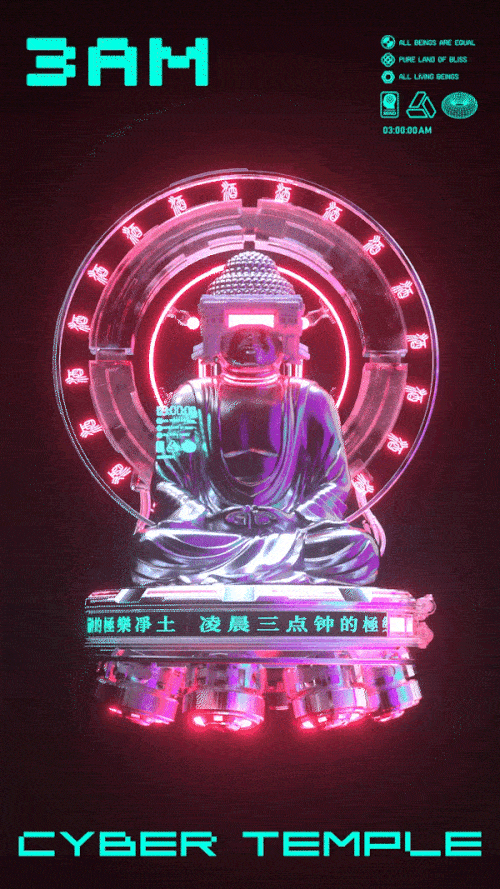 如果说第2街区,人们还在娱乐至死的红尘浮世,那么在第3街区,就是充满东方幻想与未来科技结合的极乐净土。高度发展的科技文明使人类显得渺小,人们变得边缘且性格孤僻,陷入“反乌托邦”的漩涡。我们打造一座极具东方风格的赛博寺,位列多尊机械佛为人们带来“众生平等”的美好。