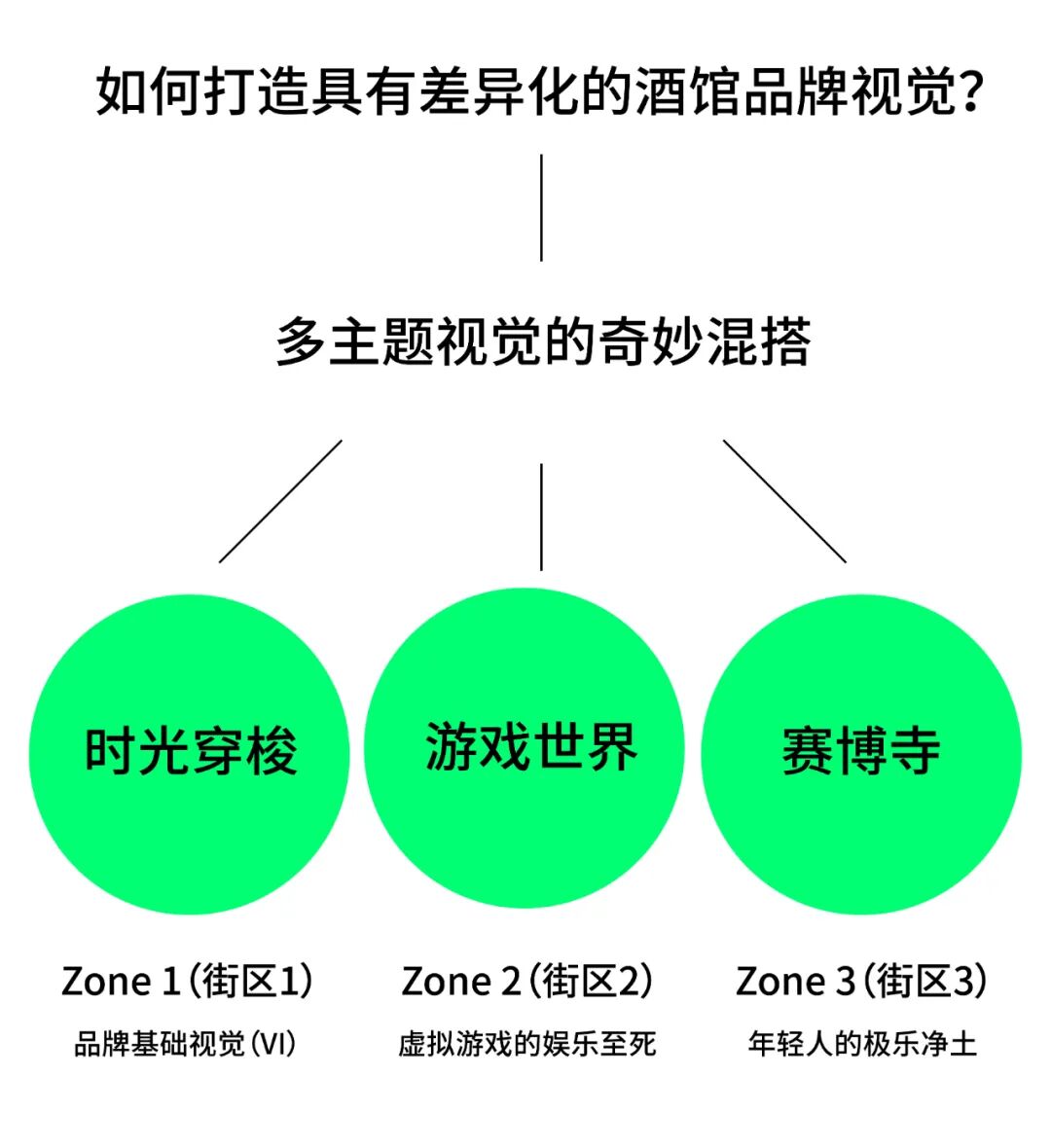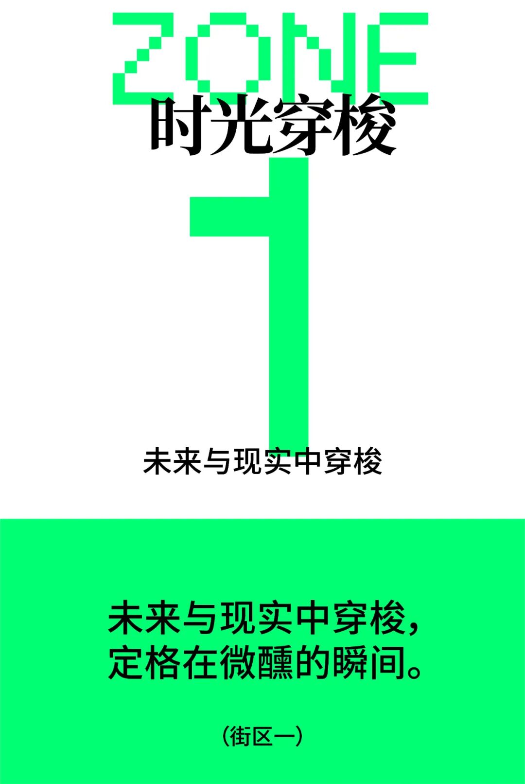 经过几轮探讨和调研,我们最终做了一个大胆的决定,就是在一家店内实现三个主题的视觉呈现,形成一个类似闯关的线性推进展示,也就是我们的超级街区概念。三个街区分别是「时光穿梭」、「游戏世界」、「赛博寺」。