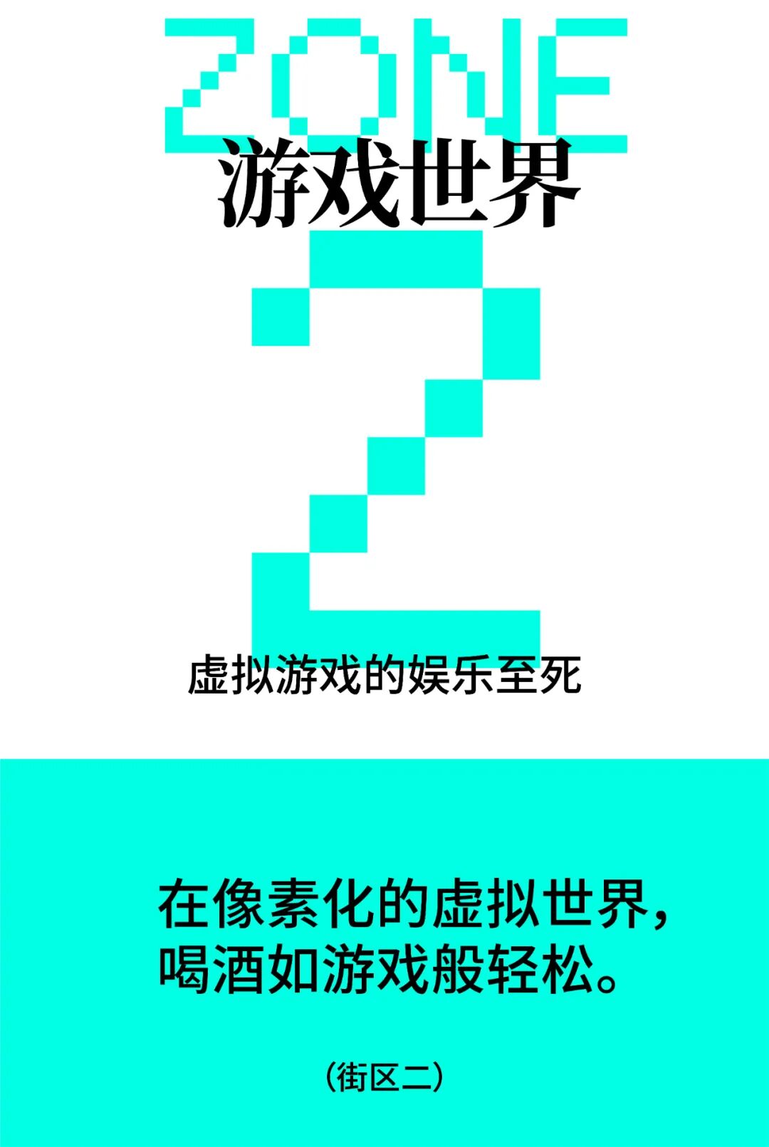 来到第2街区,微醺的人们已经不满足于现实,人类仿佛化身游戏角色,体验游戏世界中的虚幻和美好,如同酒精带来的轻松和愉悦。游戏街区、游戏元素、像素风手法从视觉上带领每个人进入游戏空间。