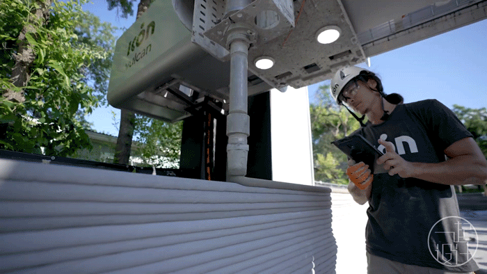 重达 9,500 磅的 Vulcan 系统以精确的技术快速地对房屋进行批量 3D 打印,并使用 ICON 开发的移动设备应用程序进行操作。