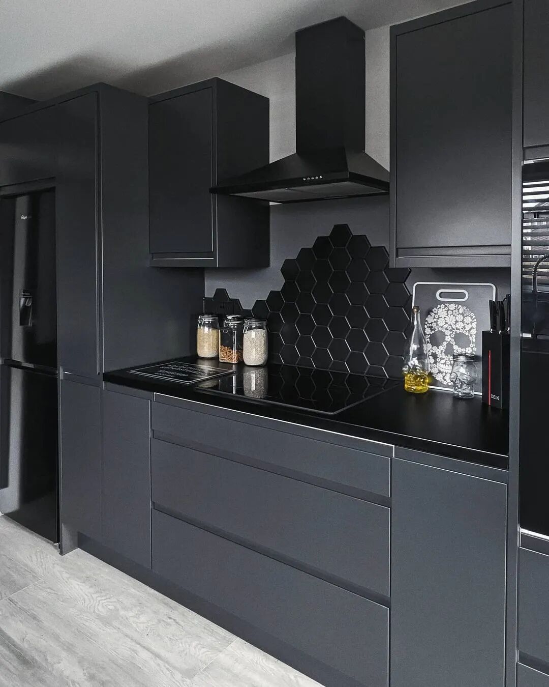 酷酷的黑色厨房呈现出强烈的现代风格,墙面上局部六边形砖做点缀,增加了层次感,更加美观个性。