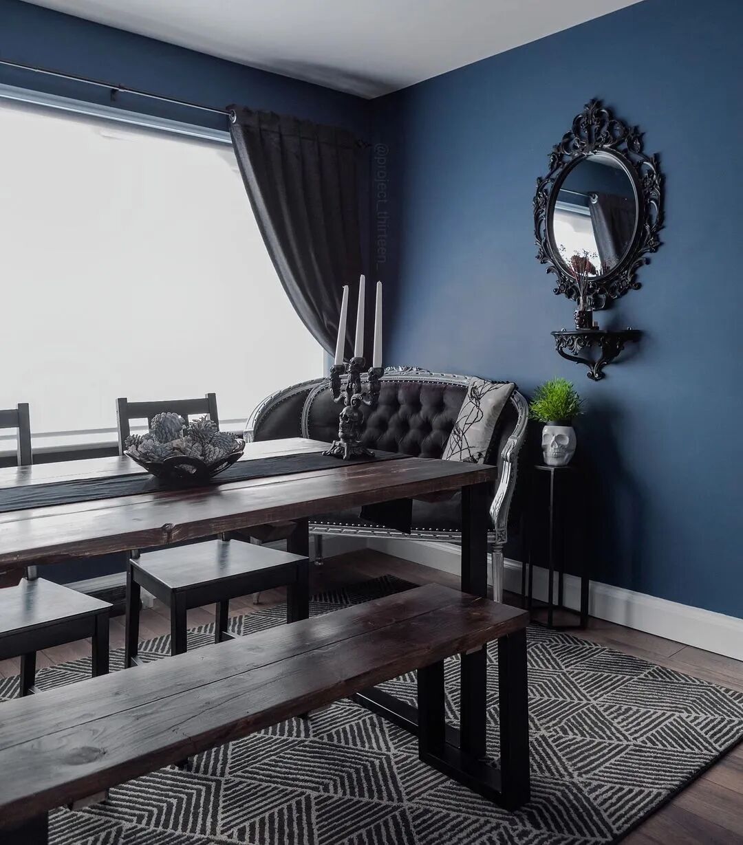 旁边深蓝色主题的餐厅在自然光的照射下散发着幽深的光晕。