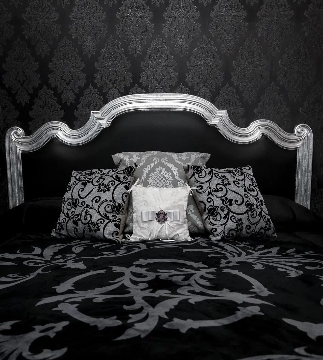 黑色壁纸与床头背板细腻的银色线条形成了冷峻的碰撞,具有哥特女王气质的卧室油然而生。
