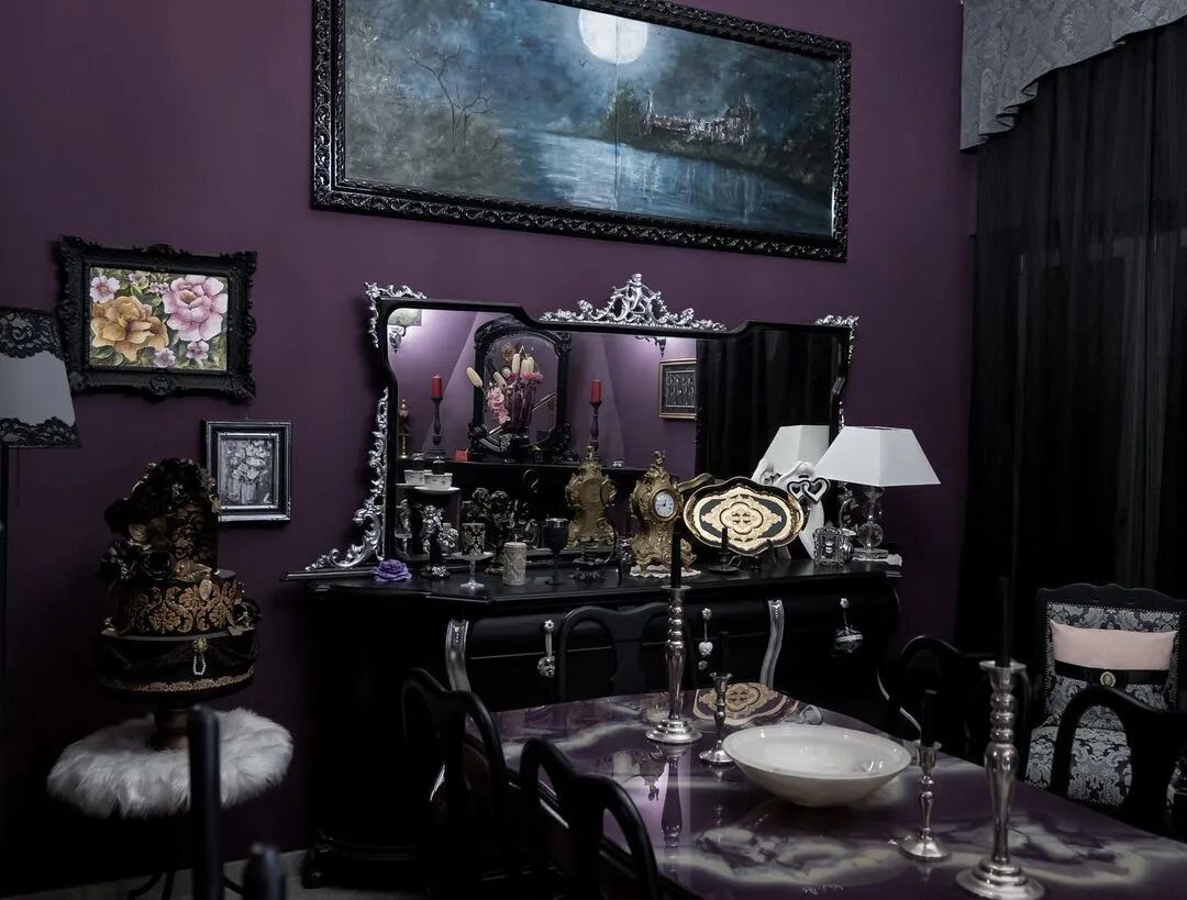 高贵神秘的紫色是贯穿空间的色彩旋律,搭配上各种样式古典的家具和装饰品,复古气氛浓郁。