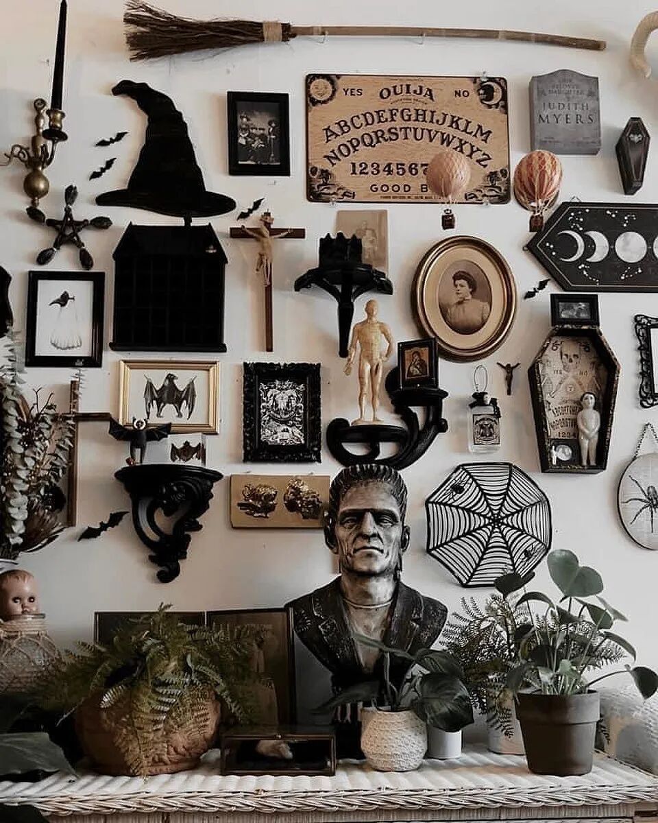客厅的一面墙上也挂满了她的收藏,蜘蛛网、标本、巫师帽......各种稀奇古怪的小玩意紧密占据了正面大白墙。