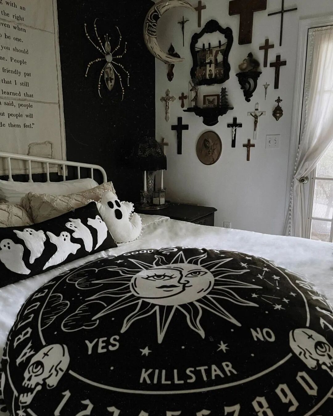 背面的黑色墙上,蜘蛛造型的镜子格外吸睛;另一侧的白墙上则装饰着大大小小的十字架,为房间渡了一层神秘的气息。