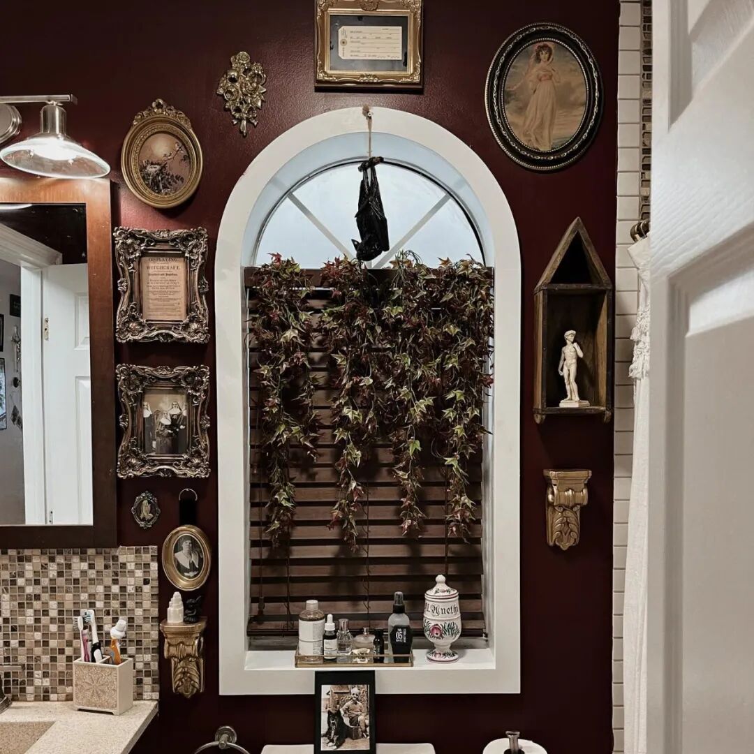 浴室中黄铜元素搭配血红色的墙面营造出浓郁的复古氛围,窗上倒吊着的蝙蝠摆件成了点睛之笔。