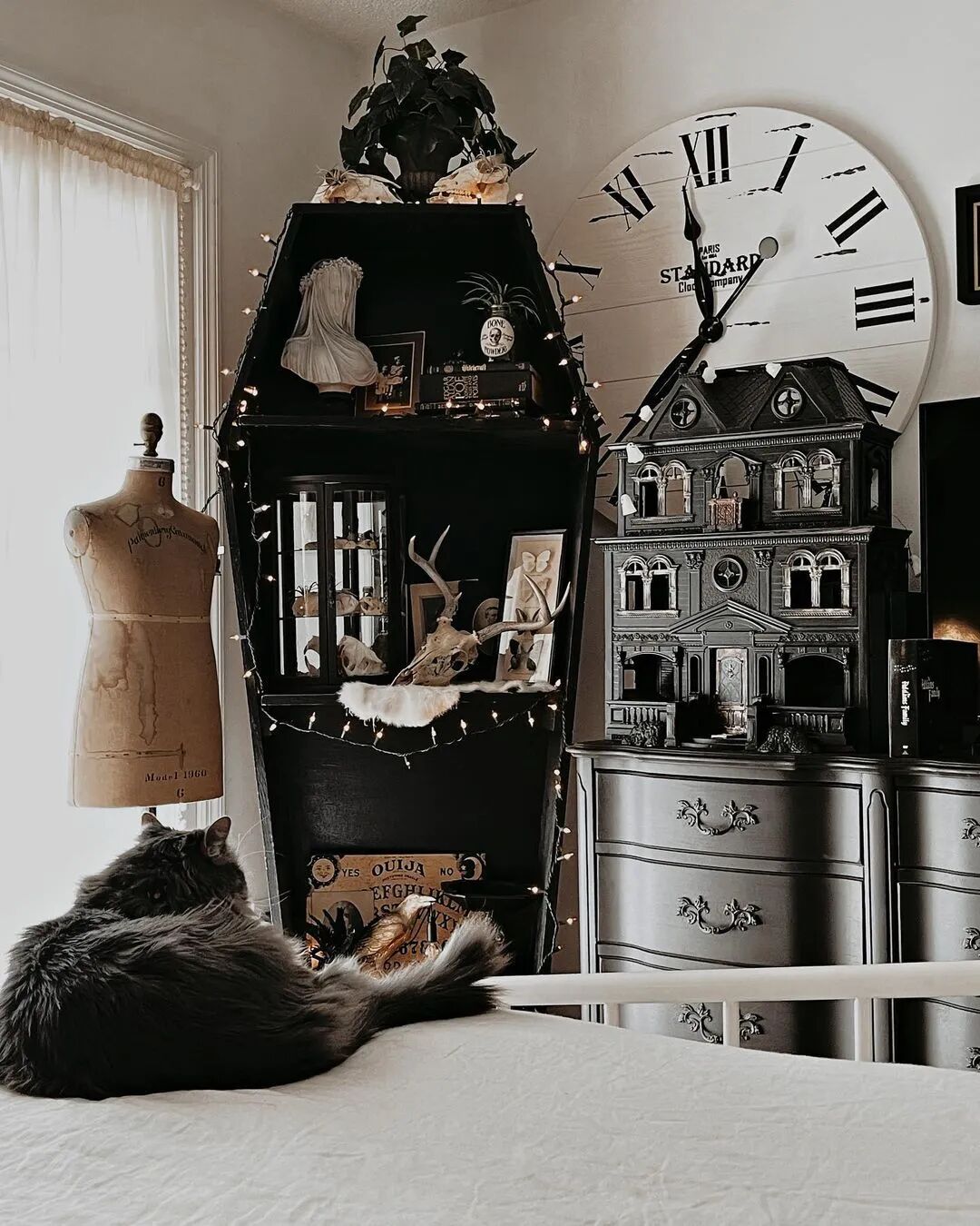 Taylor最喜欢的莫过于卧室这一角,一个棺材造型的柜子直接把氛围感拉满。