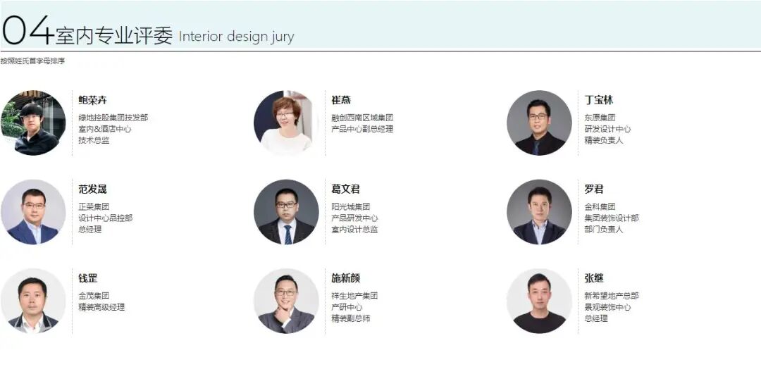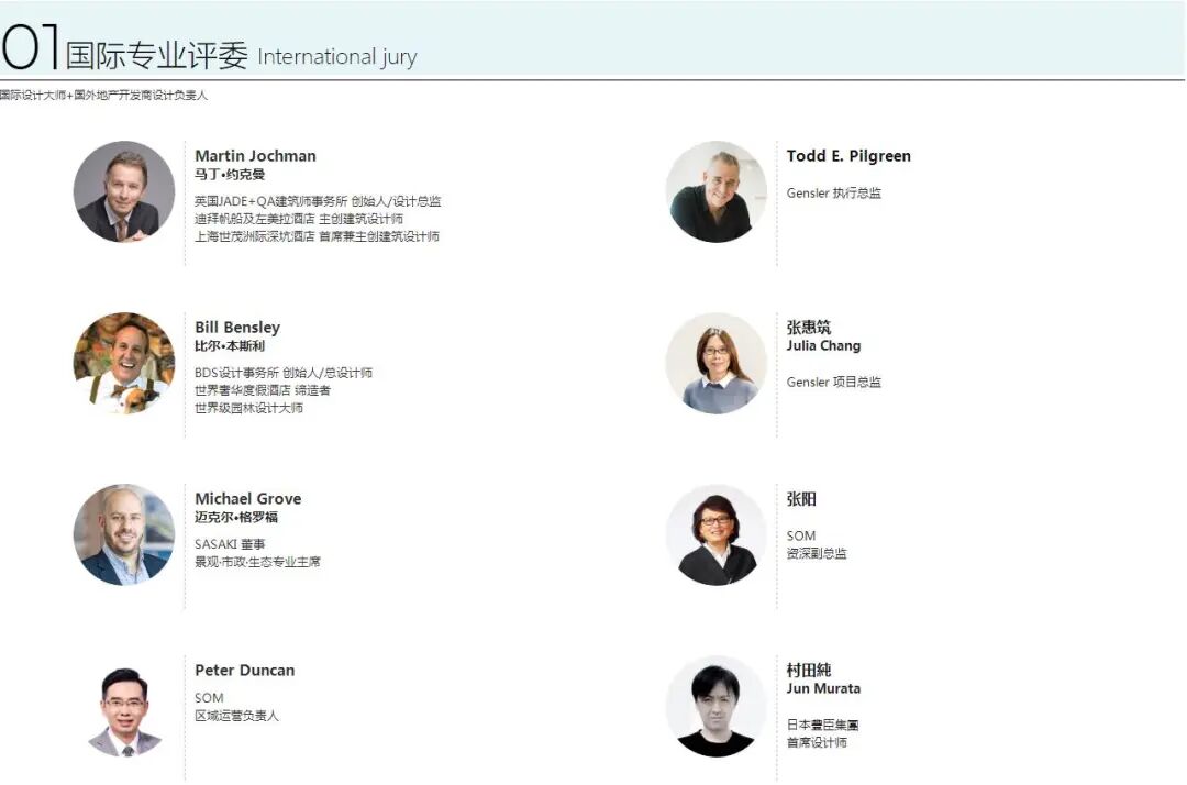 本届评委由50多位国内外各大知名地产开发单位的设计负责人担任。评选流程分为初评和终评两部分,初评由GHDA环球人居设计奖组委会资深设计师评选入围。终评由国内外各大知名地产开发单位的设计负责人组成评委团,对入围作品进行评选,最终角逐出各个类别的金奖、银奖。