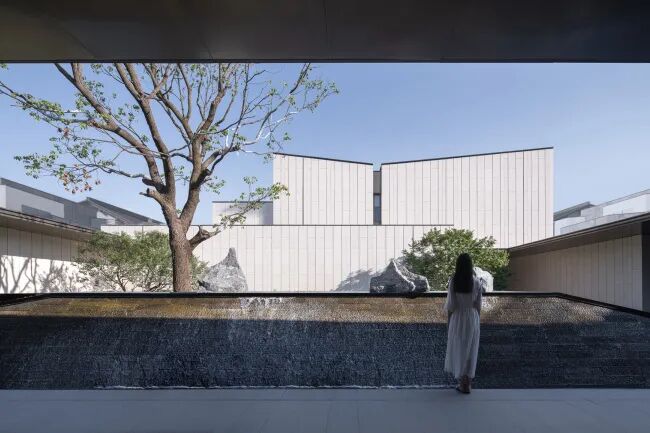 建筑师将古典与现代相结合,以序列古典的拱门造型演绎浪漫情怀,以现代简洁的玻璃幕墙重释典雅质感。虚实变化的建筑立面,轻盈的步道连廊,在光影的变换下营造出淡雅,静谧的院落氛围。将传统的元素及功能巧妙地结合于“光之塔”的艺术美学之中,力图打造出充满人文情怀的建筑展示空间。