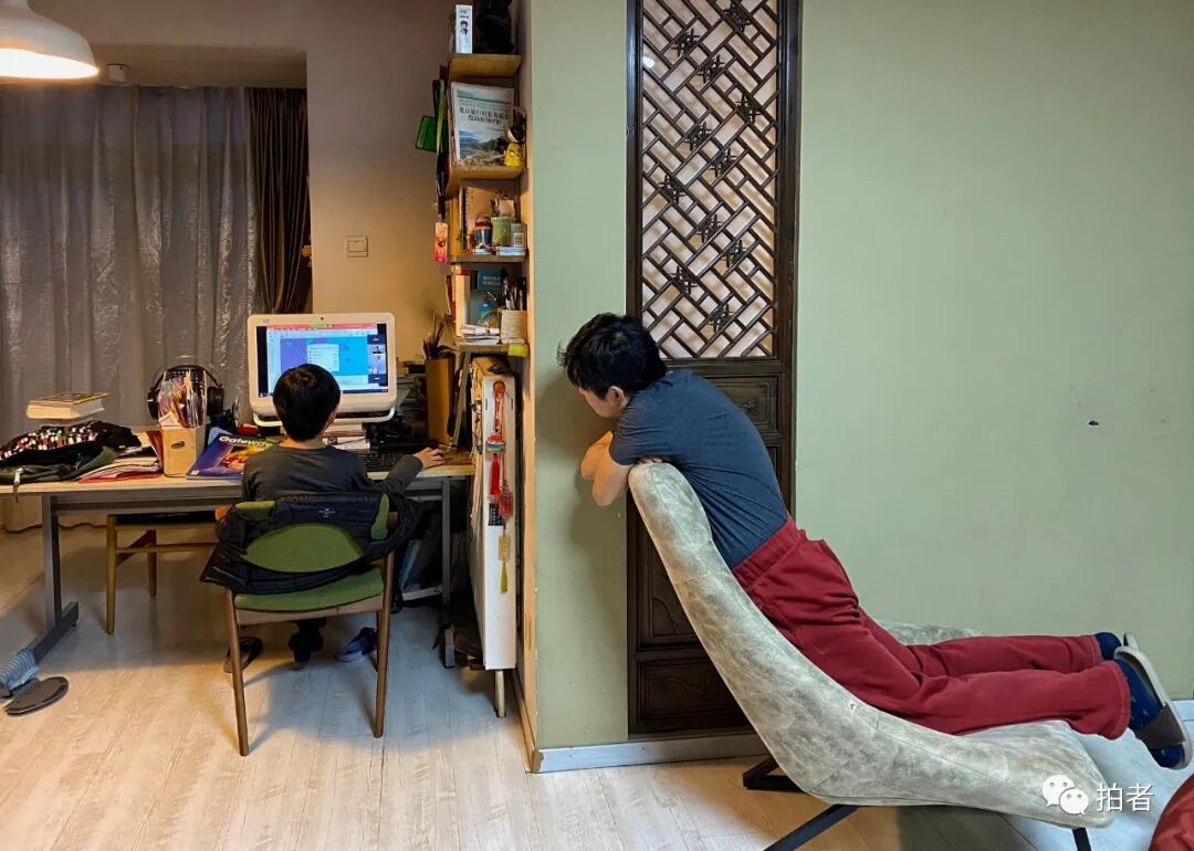 图1 北京朝阳区一住户内,一位父亲在看孩子上英语网课 ©新京报 王荟